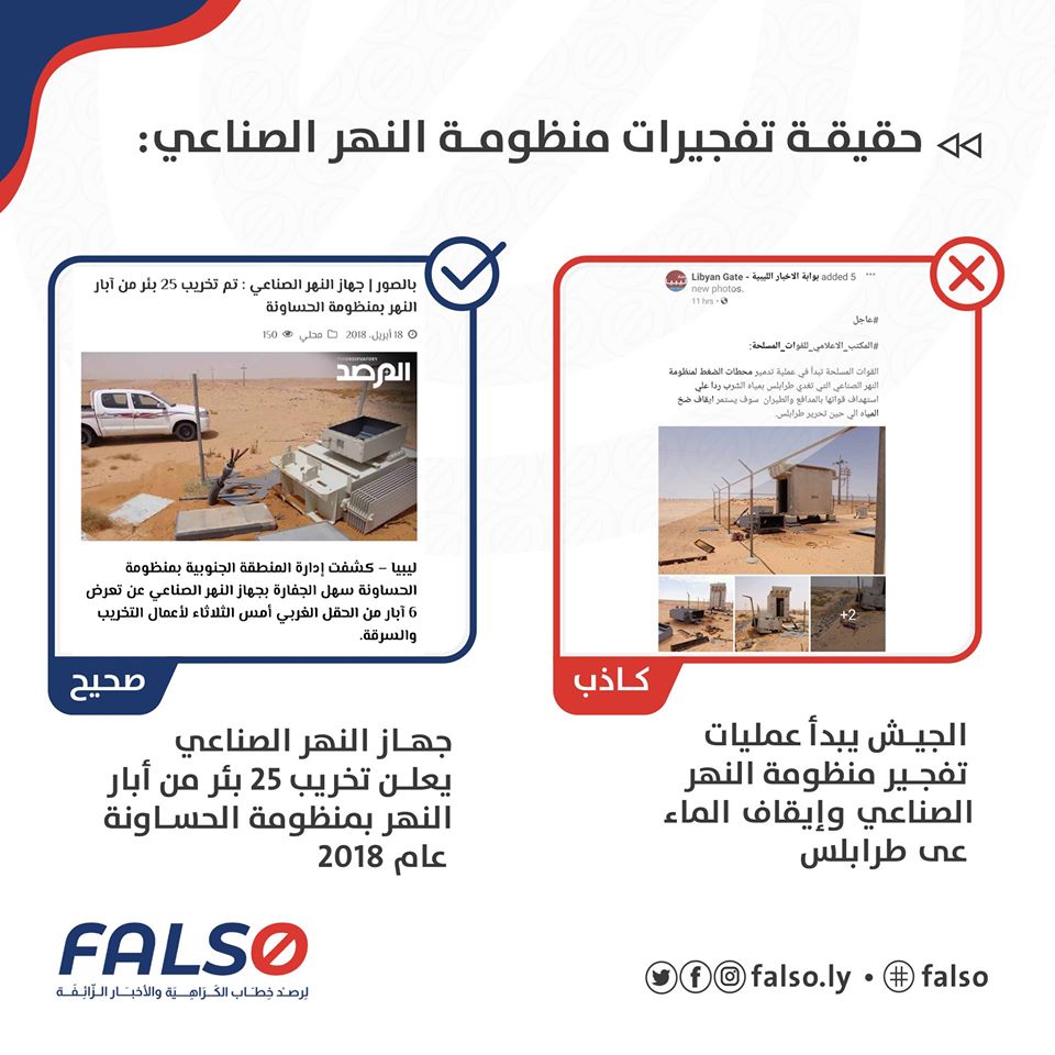 قامت صفحة بوابة الأخبار الليبية على الفيسبوك بتاريخ الأمس 07.04.2020 بنشر خبر كاذب مرفق بصور تدعي فيه أن القوات المسلحة التابعة لحفتر قد قامت بقصف محطات الضغط لمنظومة النهر الصناعي التي تغذي طرابلس بمياه الشرب.