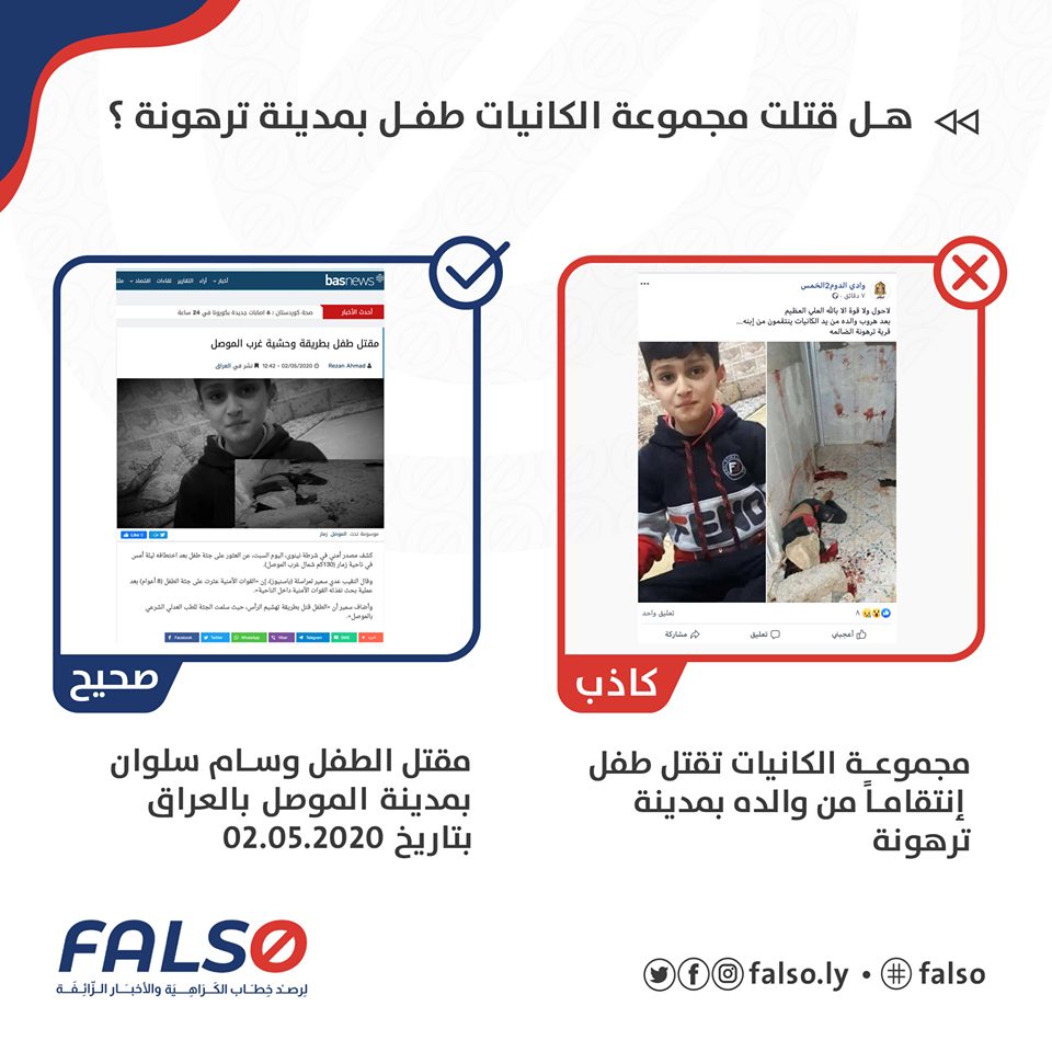 تصدرت صورة طفل في بداية عقده الثاني صفحات التواصل الاجتماعي خلال هذا الأسبوع يصاحبه خبر دموي عن طريقة قتله بطريقة متوحشة. الصفحات قالت إن هذا الطفل تم قتله من قبل مجموعة الكانيات بمدينة ترهونة، وذلك إنتقاما لهروب والده من المدينة. ❌❌