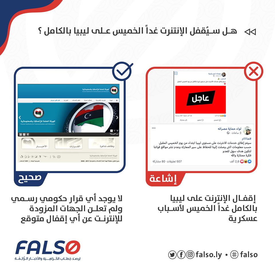 الخبر هو إشاعة تداولتها الصفحات على الفيسبوك دون مصدر أو قرار رسمي أو تصريح من أي جهة حكومية موثوقة، وبالبحث في موقع هيئة الاتصالات ومواقع شركات تزويد الإنترنت في ليبيا وصفحاتها الرسمية في مواقع التواصل الاجتماعي فلا وجود لمثل هذ الإدعاء. ❌❌
