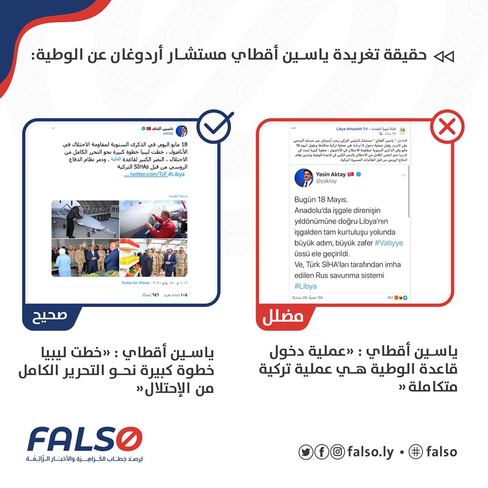 عند الرجوع لصفحة ياسين أقطاي في التوتير، وبعد ترجمة التغريدة كاملة، وجدت فالصو تضليلاً في ترجمة قناة الحدث لنص التغريدة وذلك بإضافة جملة “عملية دخول الوطية هي عملية تركية متكاملة” كما أن أقطاي قال إن ليبيا خطت خطوة كبيرة نحو التحرر الكامل، على عكس قناة الحدث التي ذكرت أن ياسين نسب هذه الخطوة لبلاده في ليبيا وأن تحرير القاعدة هي نصر تركي. ✅✅