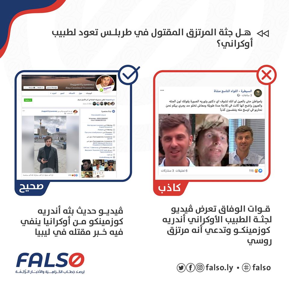 بعدما عرضت قوات الوفاق الوطني صورة جثة قالت عنها إنها تعود لمرتزق روسي الجنسية، تسارعت العديد من الصفحات على مواقع التواصل الإجتماعي وادعت أن الصورة تعود لجثة الدكتور الاوكراني (اندريه كوزمينكو) . ❌❌
