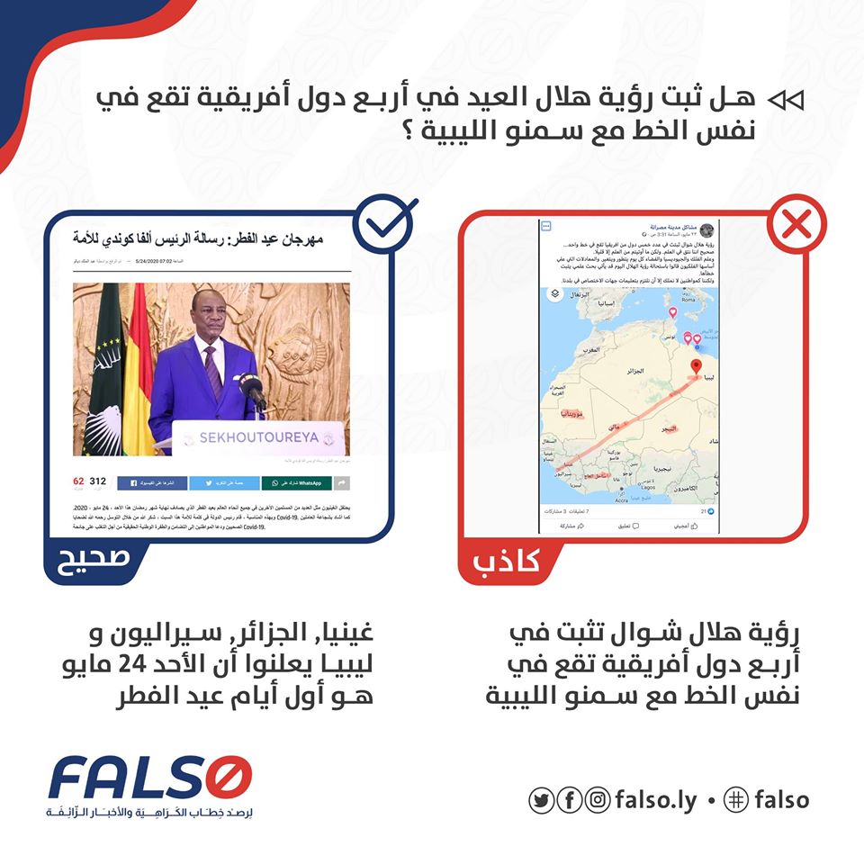 عند الرجوع للصورة، فإن أول دولة في هذا الخط هي الجزائر، والتي بدورها أعلنت أن هلال شوال لم يثبت رؤيته يوم السبت 23 مايو، وذلك بحسب بيان رسمي من وزارة الشؤون الدينية والأوقاف الجزائرية. أما ثاني الدول في هذا الخط فكانت مالي التي أعلنت أن يوم السبت 23 مايو هو أول أيام عيد الفطر، أما غينيا ثالث دولة في هذا الخط كان يوم الأحد 24 مايو هو أول أيام عيد الفطر. وأخيراً سيراليون هي الأخرى أعلنت أن عيد فطرها هو بداية من الأحد 24 مايو وبذلك يعتبر الإدعاء كاذب.
