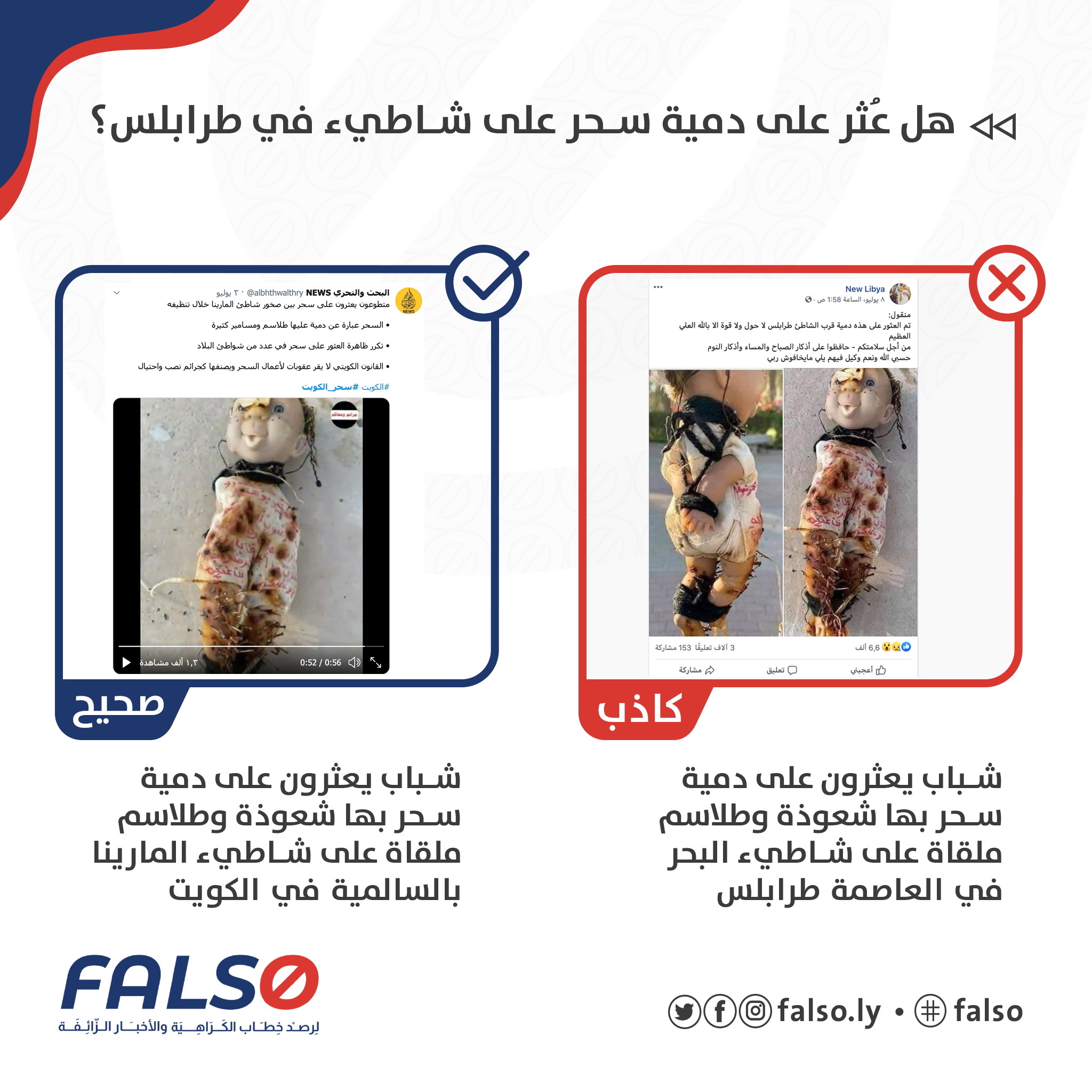 صفحات تداولت صورة إدعت أنها لدمية مكتوب عليها طلاسم وعبارات سحريةوغرزت فيها مسامير وكان عليها آثار حروق، بحسب ما ظهرت عليه في بعض الصور أثناء قيام مجموعة من الشباب في تنظيف أحد الشواطئ في طرابلس. الخبر انتشر بسرعة في صفحات الفيسبوك ليحقق العديد من التفاعلات والمشاركات لهذا الخبر. ❌❌