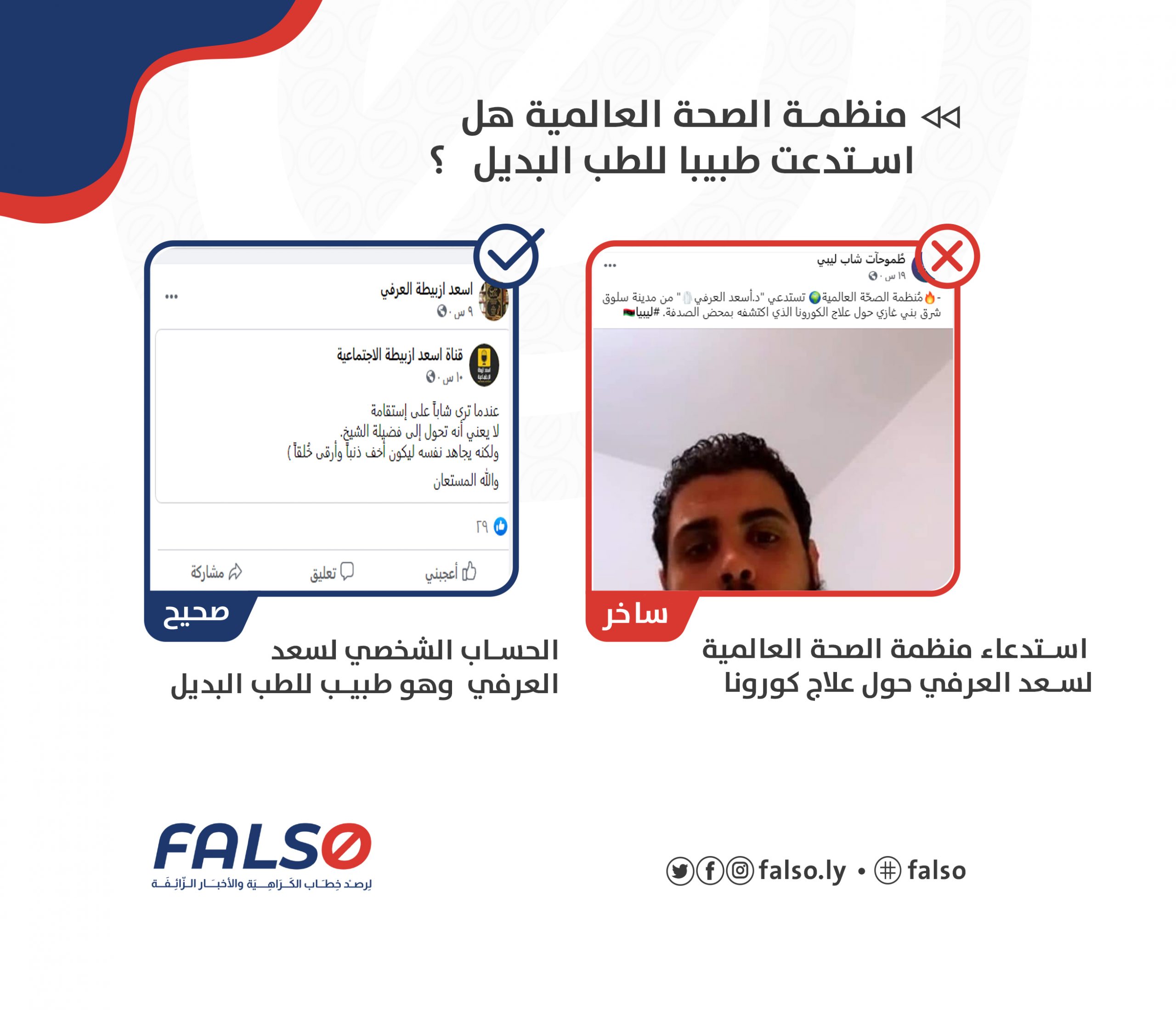 في ظل البحث المتكرر عن علاج أو لقاح يكافح الجائحة التي هزت العالم بأثره وهي جائحة فيروس كورونا .. انتشر عبر مواقع صفحات بالفيس بوك خبر أن منظمة الصحة العالمية قد استعدت الدكتور سعد ازبيطية العرفي القادم من مدينة سلوق الواقعة جنوب مدينة بنغازي وذلك بعد توصله لعلاج الجائحة الذي اكتشفه بمحض الصدفة . ❌❌