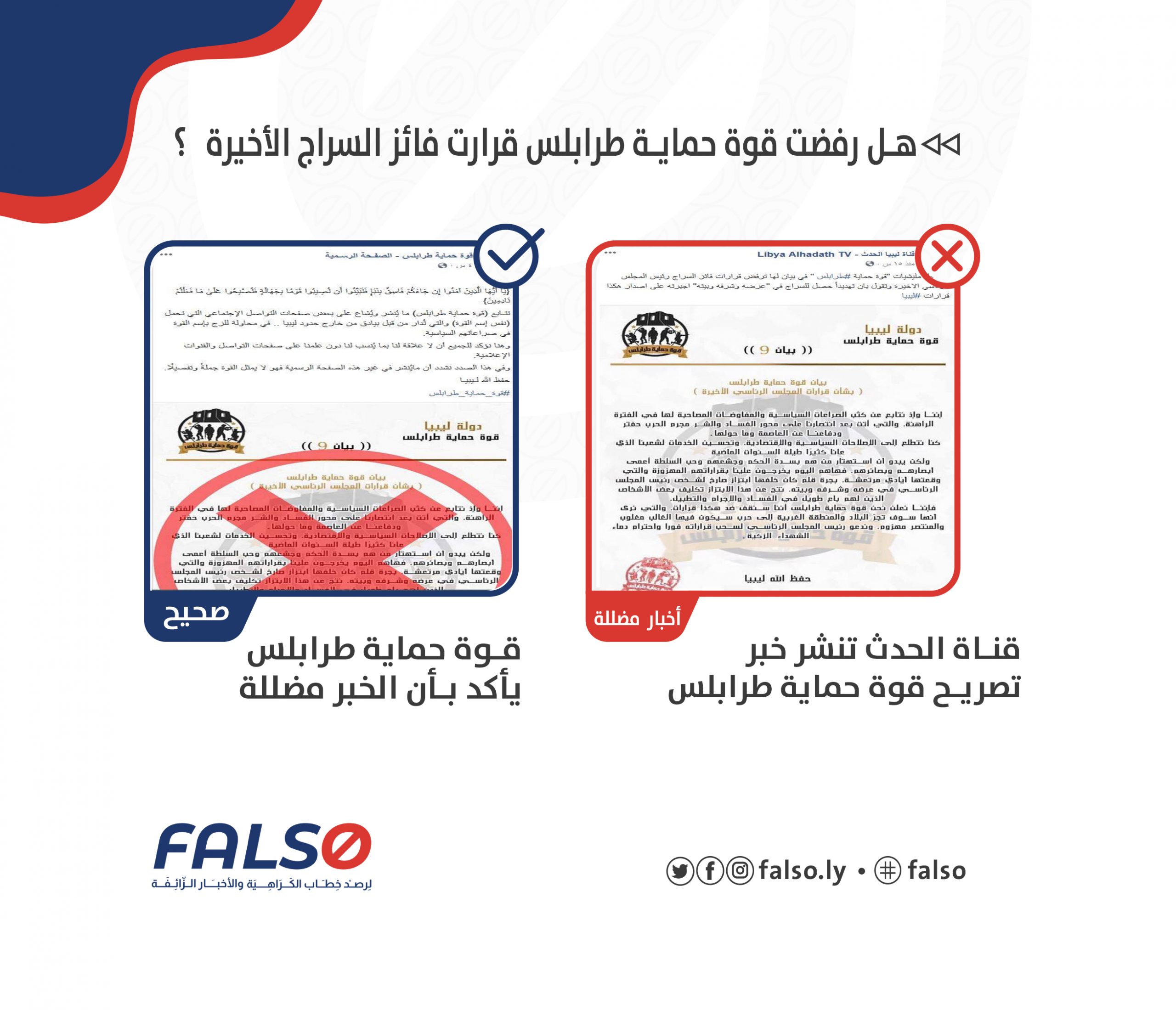 نشر في صفحة الفيس بوك قناة ليبيا الحدث خبر مضلل بأنه صرحت “قوة حماية طرابلس ” في بيان لها “ترفض قرارات فائز السراج رئيس المجلس الرئاسي الاخيرة وتقول بأن تهديداً حصل للسراج في “عرضه وشرفه وبيته” اجبرته على إصدار هكذا قرارات. ❌❌