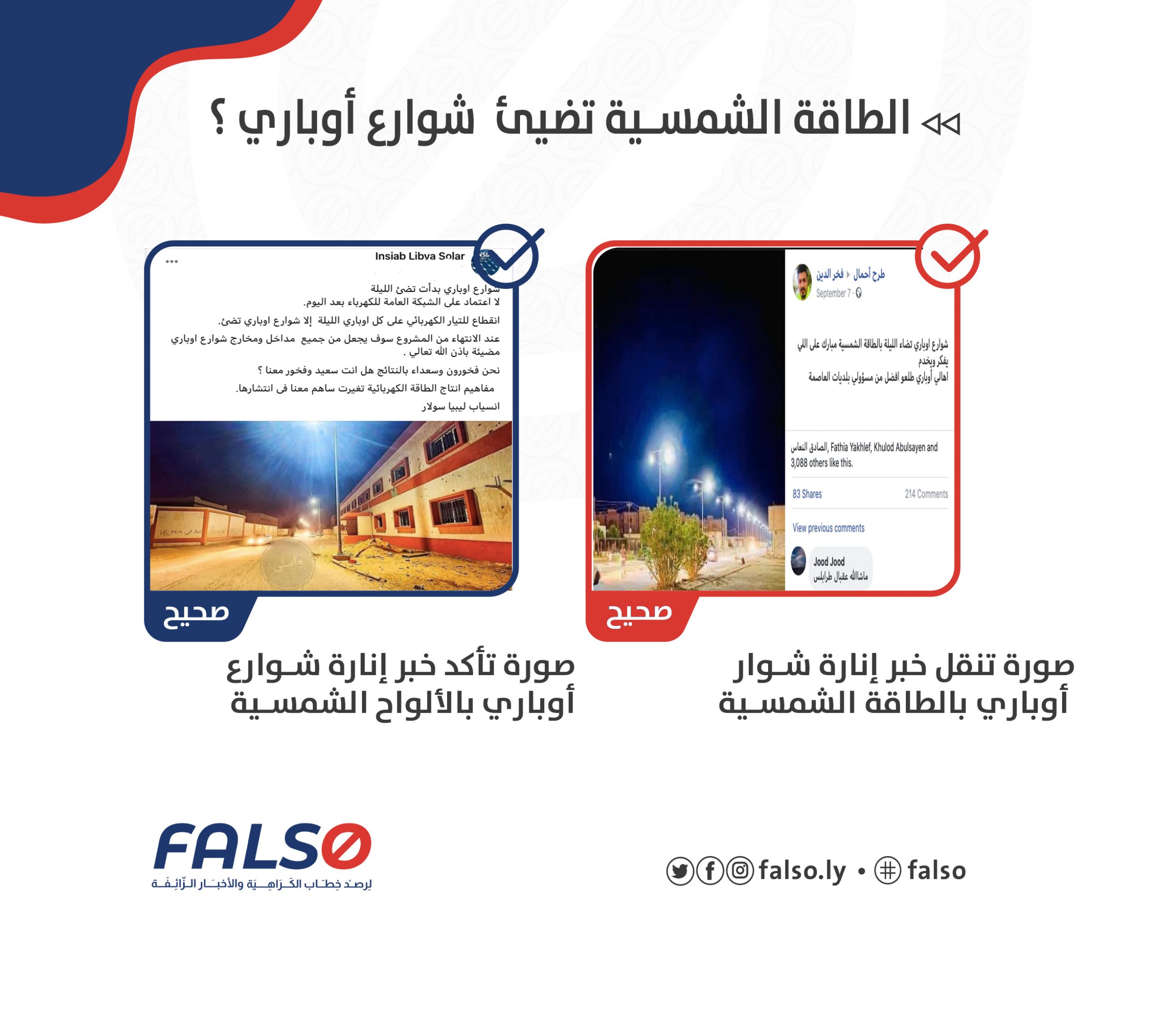 ومن خلال عملية البحث والتحقق من صحة الخبر عبر الجهات المذكورة في إنجاز المشروع، اتضح أن المشروع يتبع برنامج الأمم المتحدة الإنمائي بالتعاون مع شركة انسياب لحلول الطاقة الشمسية وهو مشروع يستمر إلى أربع أشهر ويعمل على إنارة كافّة شوارع المدينة ومداخلها ومخارجها باستعمال ألواح الطاقة الشمسية وهو جزء من مشروع دعم البلديات الذي يقدمه برنامج الأمم المتحدة الإنمائي لدعم البلديات في تحقيق الإستقرار وتحسين الخدمات، مزال المشروع قيد الإنجاز وهو في مرحلته الأولى وفق ما افادنا به عميد بلدية أوباري السنوسي شادكو.. ✅✅