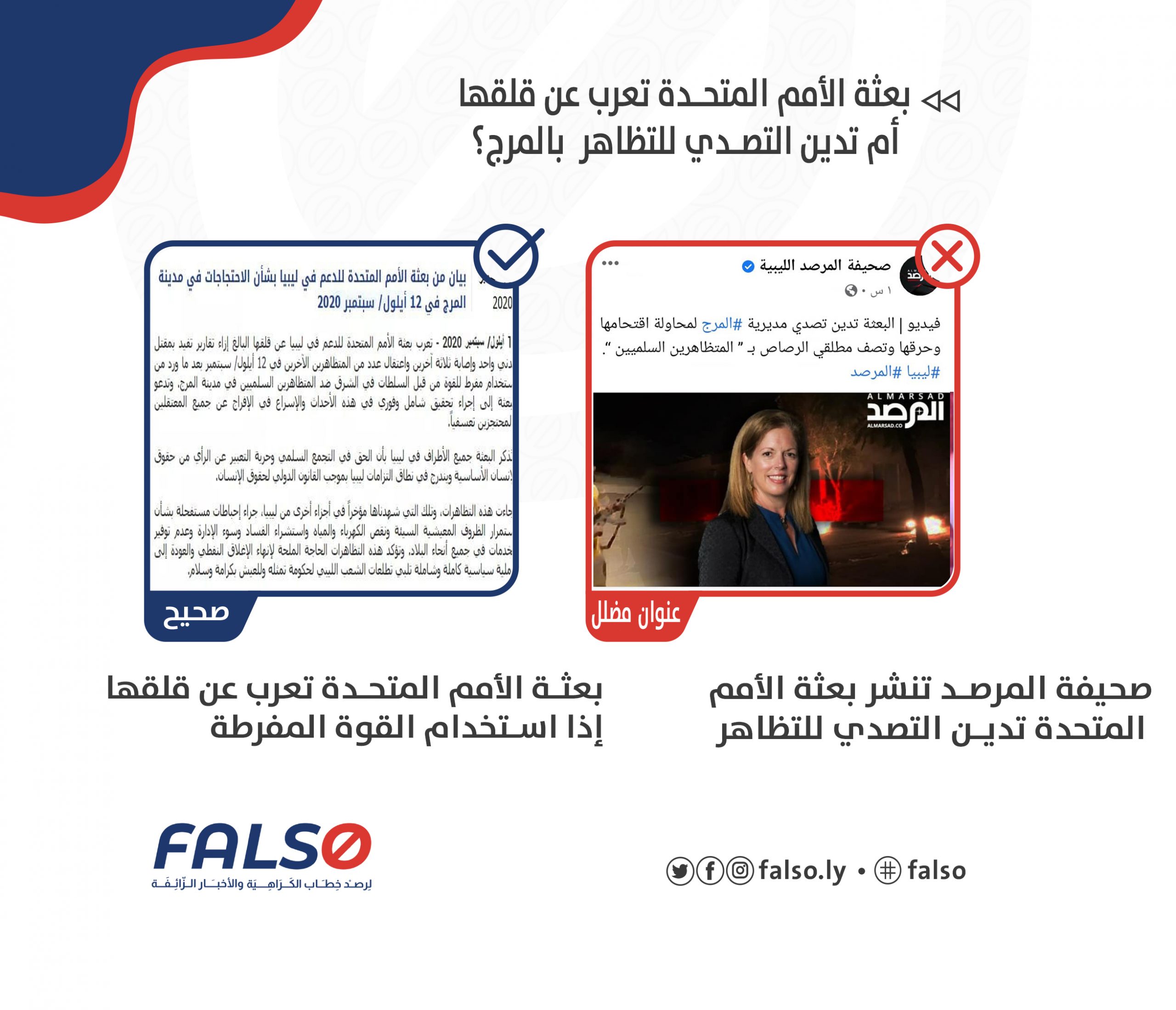 نشرت صحيفة المرصد الليبية خبراً نقلاً عن البعثة الأمم المتحدة للدعم في ليبيا ، قولها إن الأخيرة تٌدين تصدي مديرية الأمن في المرج لمحاولة إقتحامها وحرقها من قبل المتظاهرين ، وبالعودة لنص البيان الرسمي المنشور بالموقع الرسمي لبعثة الأمم المتحدة في ليبيا ، نجد إن العديد من الكلمات والجمل التي لم تستخدم في البيان الصحفي الرسمي وتحريفه ، مما يٌعتبر إنه خبر صحفي مٌضلل .❌❌