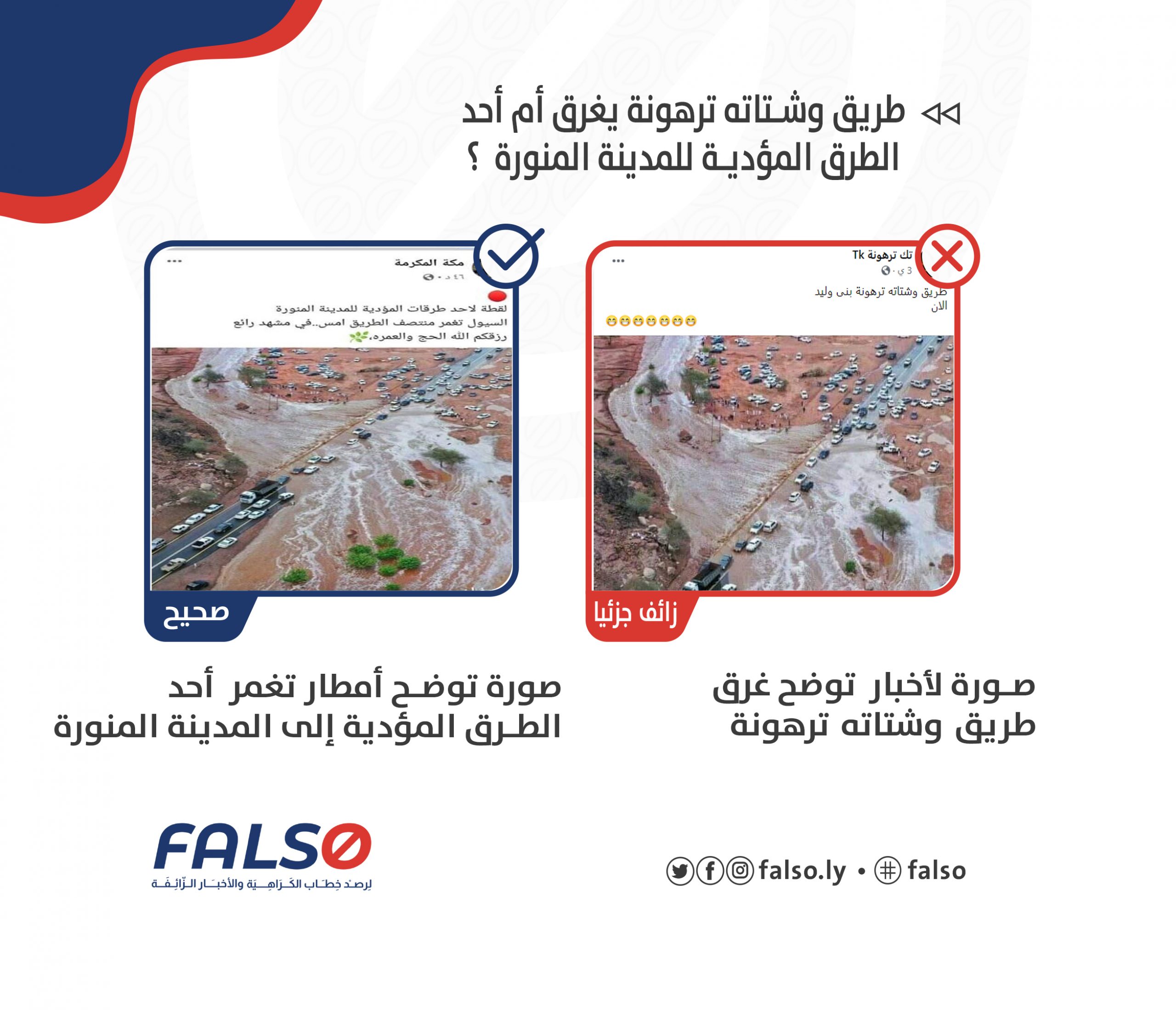 تحقق فريق فالصوا من الصورة المنشورة عبر محركات “جوجل ” حيث تبين أن الصورة تعود لحد الطرقات المؤدية إلى المدينة المنورة في المملكة العربية السعودية والتي نشرت عبر صفحة مكة المكرمة التي اعتبرتها كمشهد رائع دون التحذير من إنها كارثة . ✅✅