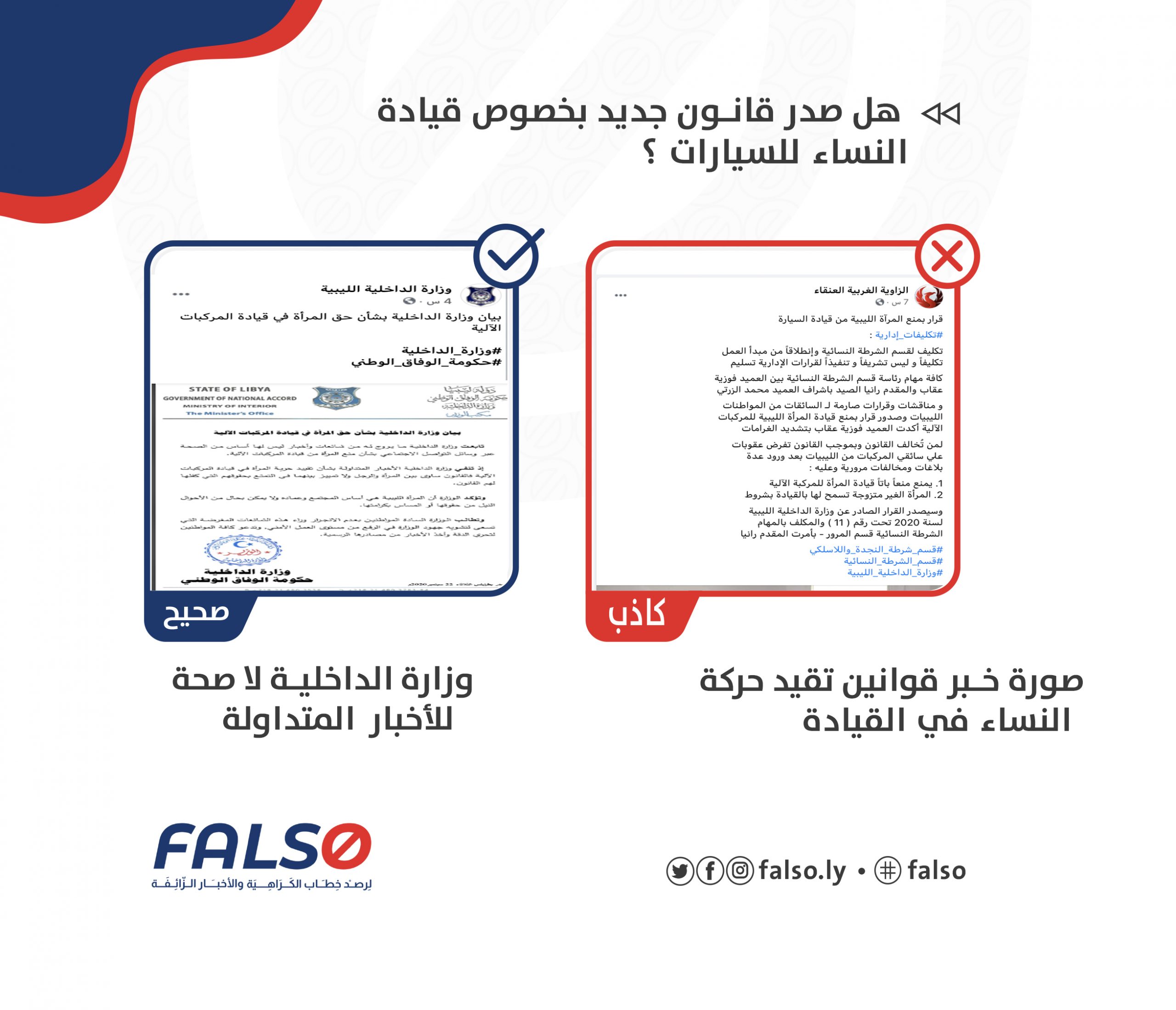 تعمدت بعض صفحات مواقع التواصل الاجتماعي نشر اخبار تدعي فيها تفعيل قوانين من قبل الجهات التنفيذية لتقيد من حركة النساء فيما يخص قيادة السيارات والتنقل في المركبات الالية في ليبيا.❌❌