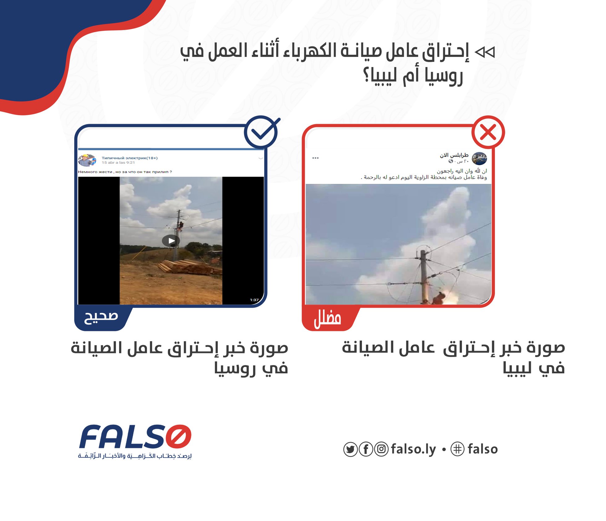 وعند البحث والتحقق من الصورة المنتشرة مع الخبر تبين أنها ليست لعامل صيانة كهرباء داخل ليبيا وإنما هي تعود لإحتراق عامل اثناء صيانته للكهرباء في روسيا وذلك بتاريخ 15 أبريل من العام الجاري . ✅✅