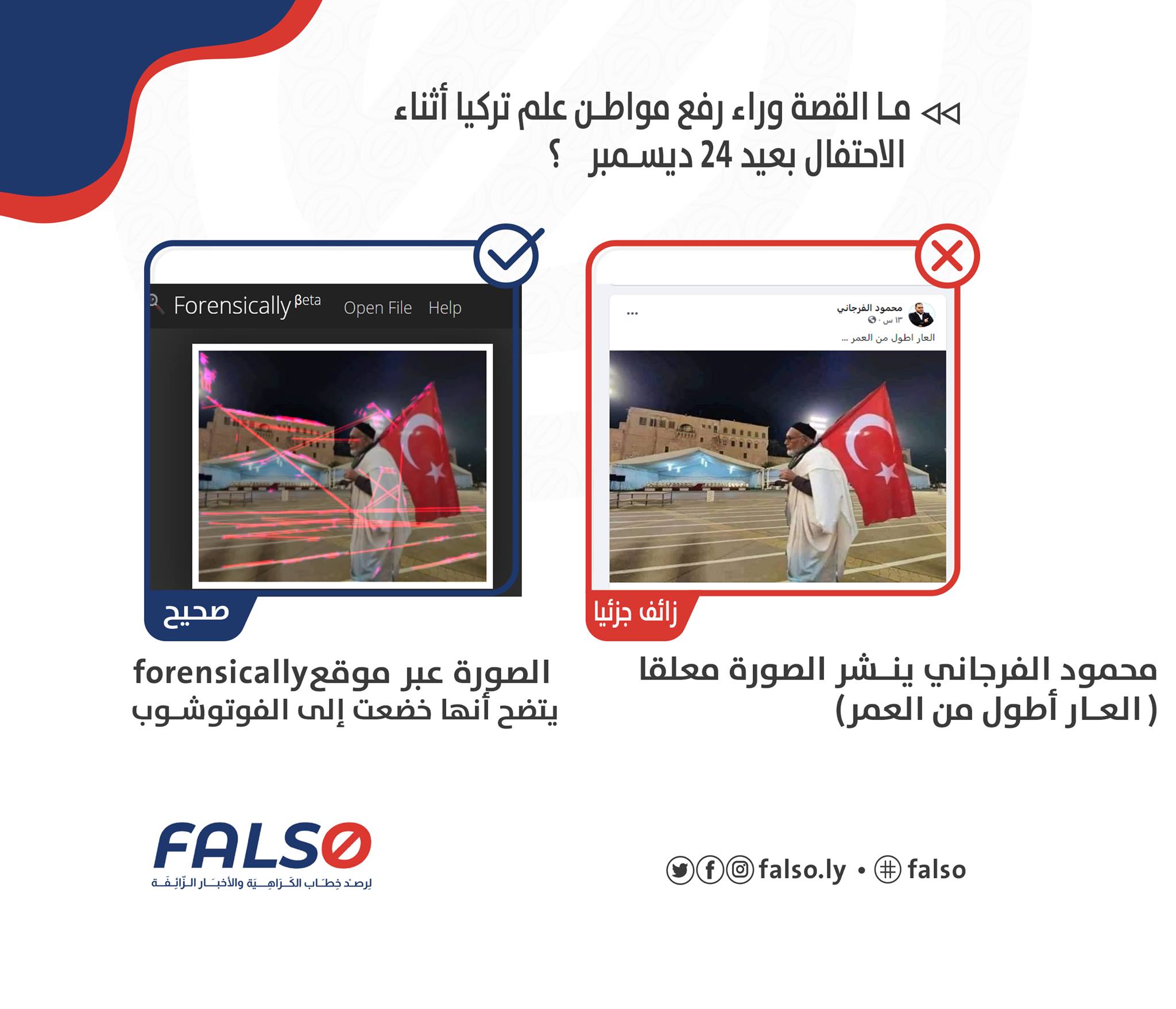 تمكن فريق فالصو بعد عملية التحقق التي بدأ خطوتها من البحث العكسي عبر محركات جوجل من معرفة أن الصورة التي عرضت في صفحة الصحفي محمود الفرجاني مدير قناة ليبيا الحدث مزيفة حيث كانت خطوات البحث كالآتي استطاع فريق التحقق عبر موقع TinEye الوصول إلى صورة المسن وهو يحمل علمي ليبيا وتركيا الأولى منشورة بتاريخ 30\4\2020 عبر موقع crisisgroup والأخرى نشرت عبر موقع thinkinghumanity بتاريخ 26\6\2020 وأخرى نشرت عبر موقع crisisgroup بتاريخ 8\5 \2020 كما وتمكن أيضا من خلال موقع forensically الكشف عن أن الصورة التي تم نشرها قد خضعت الى عمليات فوتوشوب ✅✅
