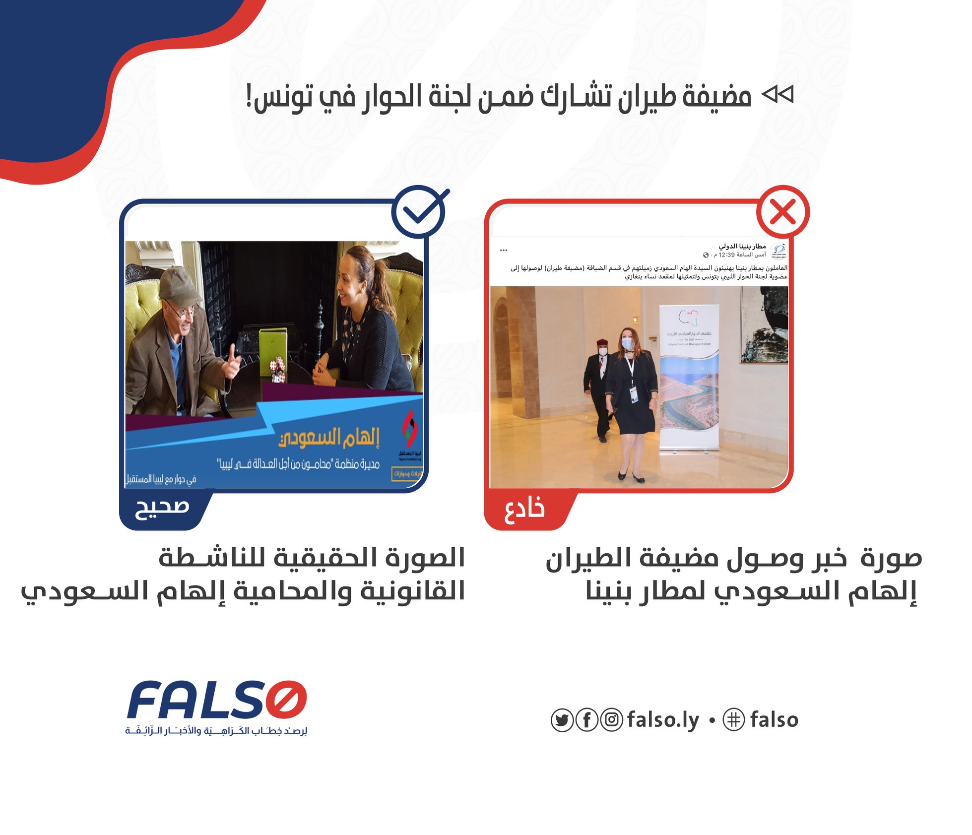 عند التحقق من الخبر والبحث عن اسم إلهام السعودي ضمن قائمة لجنة الحوار الليبي الذي تستضيفه تونس، وجدنا أن الصورة ليست لإلهام السعودي وأنها بالفعل أحد أعضاء لجنة الحوار بتونس ولكن ليس لها علاقة بضيافة الطيران، فهي محامية وناشطة قانونية معروفة، ومقيمة في لندن منذ فترة طويلة، وهي من المؤسسين لمنظمة محامون من أجل العدالة في ليبيا ومديرتها حالياً، وتعمل بالمحاماة في بريطانيا من العام 2003، ومن ضمن قاعدة زبائنها نادي أرسنال لكرة القدم، وشركة كادبوري العمومية المحدودة، ومؤسّسة رويترز، والبنك الدولي. ✅✅