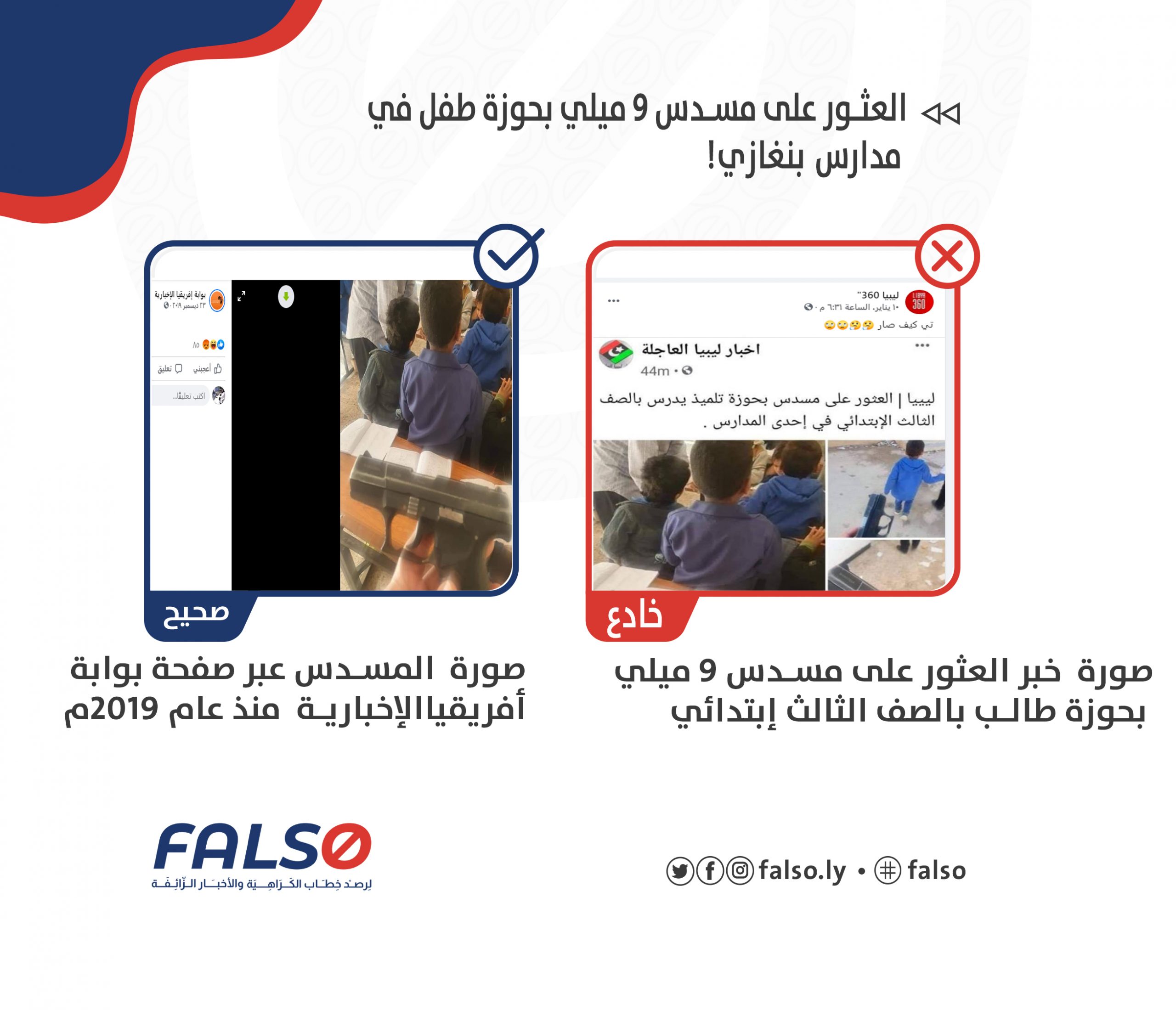 صفحة   ليبيا 360  وهي مدون شخصية يتابعها ما لا يقل عن 15843 شخصا كما تحصلت على نسبة إعجاب يصل إلى 15223 وهي صفحة مخصصة لنقل الاخبار الاجتماعية المختلفة من جميع مناطق ليبيا .. حيث نشر بتاريخ 10\يناير \2021  خبر نقلته عن صفحة أخبار ليبيا العاجلة  مفاده العثور علي مسدس بحوزة تلميذ في السنة الثالث الابتدائي داخل أحد مدارس  منطقة الفويهات ببنغازي..  ومن دون التحقق من صحة الخبر وتاريخ انتشاره تناقلت منصات مؤسسات إعلامية عدة الخبر وانتشر كالنار على الهشيم فيما بينها معلقا  على الصورة بأنها الفوضى التي تعيشها ليبيا منذ احداث 2011م ❌❌