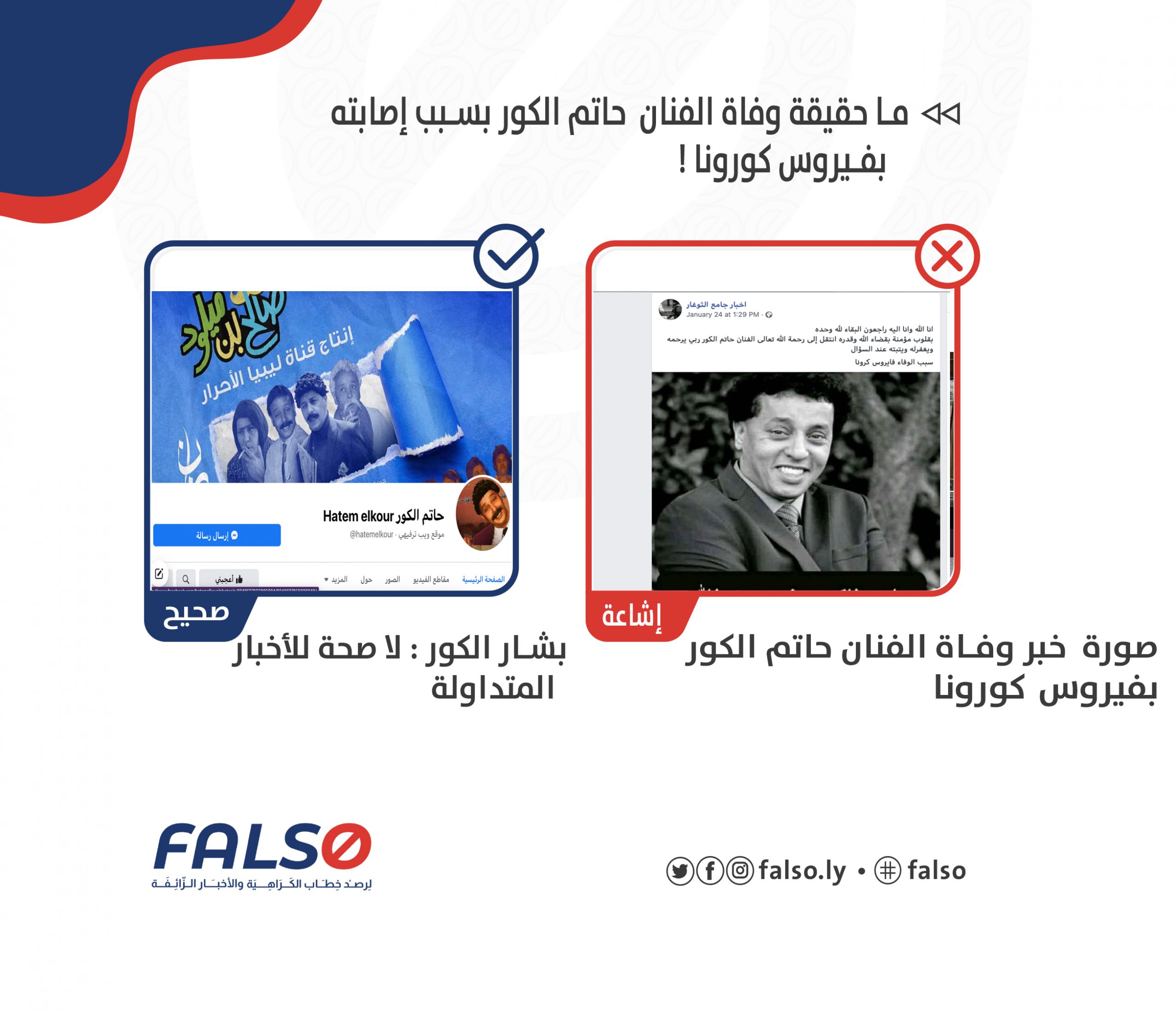 وعند البحث في الصفحة الرسمية للفنان حاتم الكور عبر الفيس بوك تبين أنه لم يتم الإشارة إلى نعي أو إعلان عن خبر الوفاة كما و أنه لا وجود في كافة المنصات الإخبارية ما يفيد بحدوث حالة الوفاء ونعي رسمي قدم إلى اسرة الفنان حاتم الكور حيث استطاع فريق فالصو التواصل عبر الهاتف مع شقيق الفنان حاتم (بشار الكور )الذي نفى لفالصو صحة الأخبار المتداولة وأكد بأن شقيقه يتمتع بصحة جيدة ✅✅