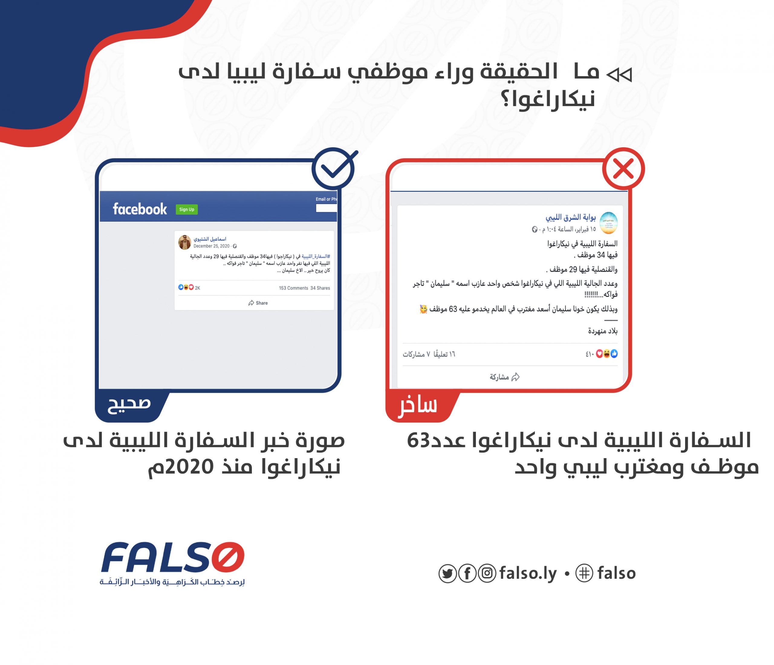 نُشر عبر صفحة تحمل اسم “بوابة الشرق الليبي” وهي صفحة تحمل صفة وكالة إعلام اجتماعية يتابعها ما لا يقل عن 75945 متابعا … حيث نشرت بتاريخ 10، فبراير، 2021 م خبرا ساخرا مفاده “السفارة الليبية في نيكاراغوا فيها 34 موظفا، والقنصلية فيها 29 موظفا، وعدد الجالية الليبية التي في نيكاراغوا شخص واحد عازب اسمه سليمان” تاجر فواكه، وبذلك يكون أخونا سليمان أسعد مغترب في العالم يخدموا عليه 63 موظفا”، الخبر تناقله بعض المدونين عبر صفحاتهم الشخصية، وبعض الوسائل الإعلامية دون التقصي من صحة الخبر. ❌❌