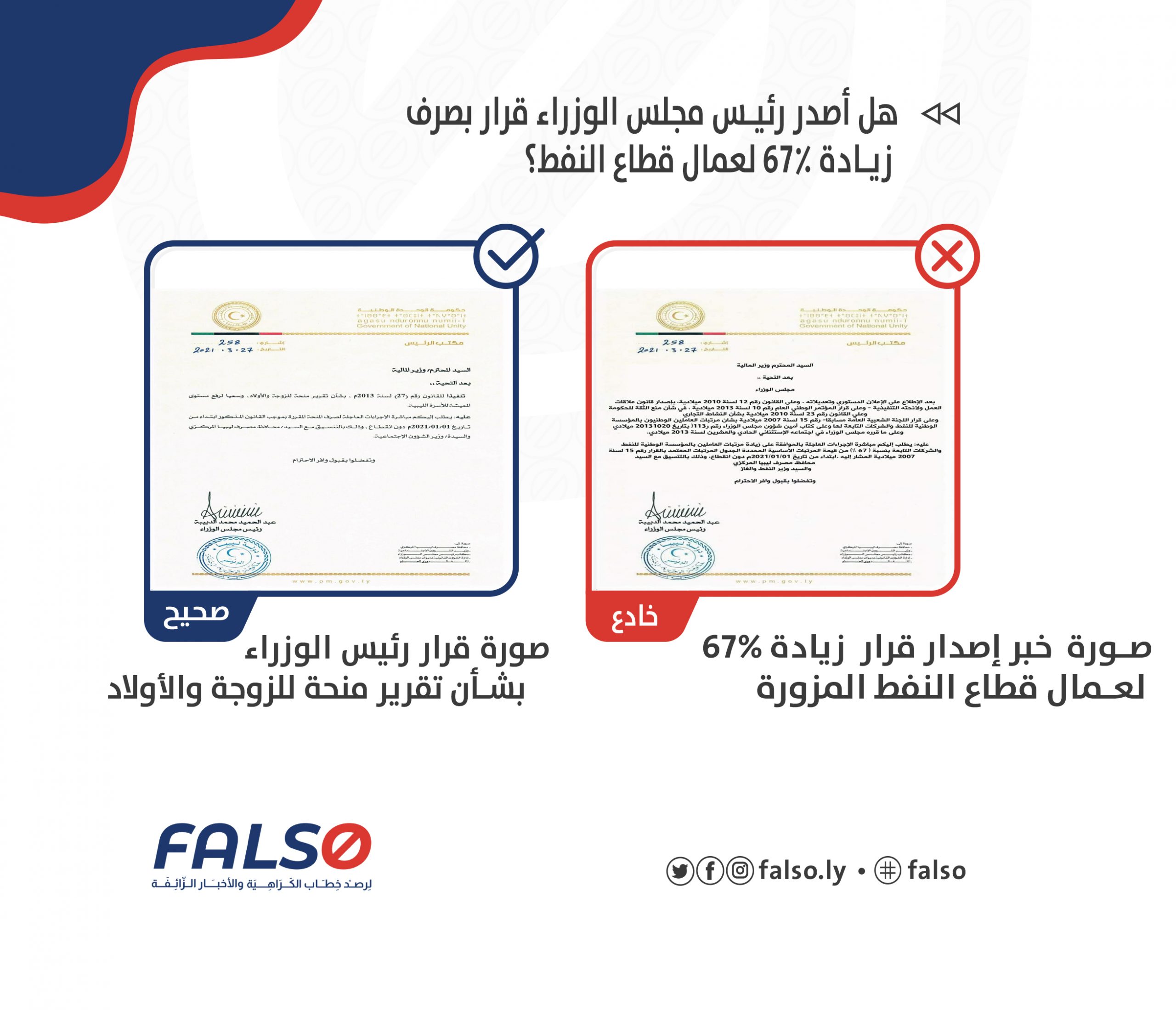نُشر عبر مواقع التواصل الاجتماعي في الفيس بوك صورة لقرار صدر من رئيس حكومة الوحدة الوطنية بتاريخ 28\مارس 2021 م مفاده (رئيس حكومة الوحدة الوطنية يوجه رسالة عاجلة لوزير المالية بخصوص ضرورة المباشرة في الإجراءات العاجلة لصرف زيادة 67٪ لكافة الموظفين التابعين لقطاع النفط ) ❌❌