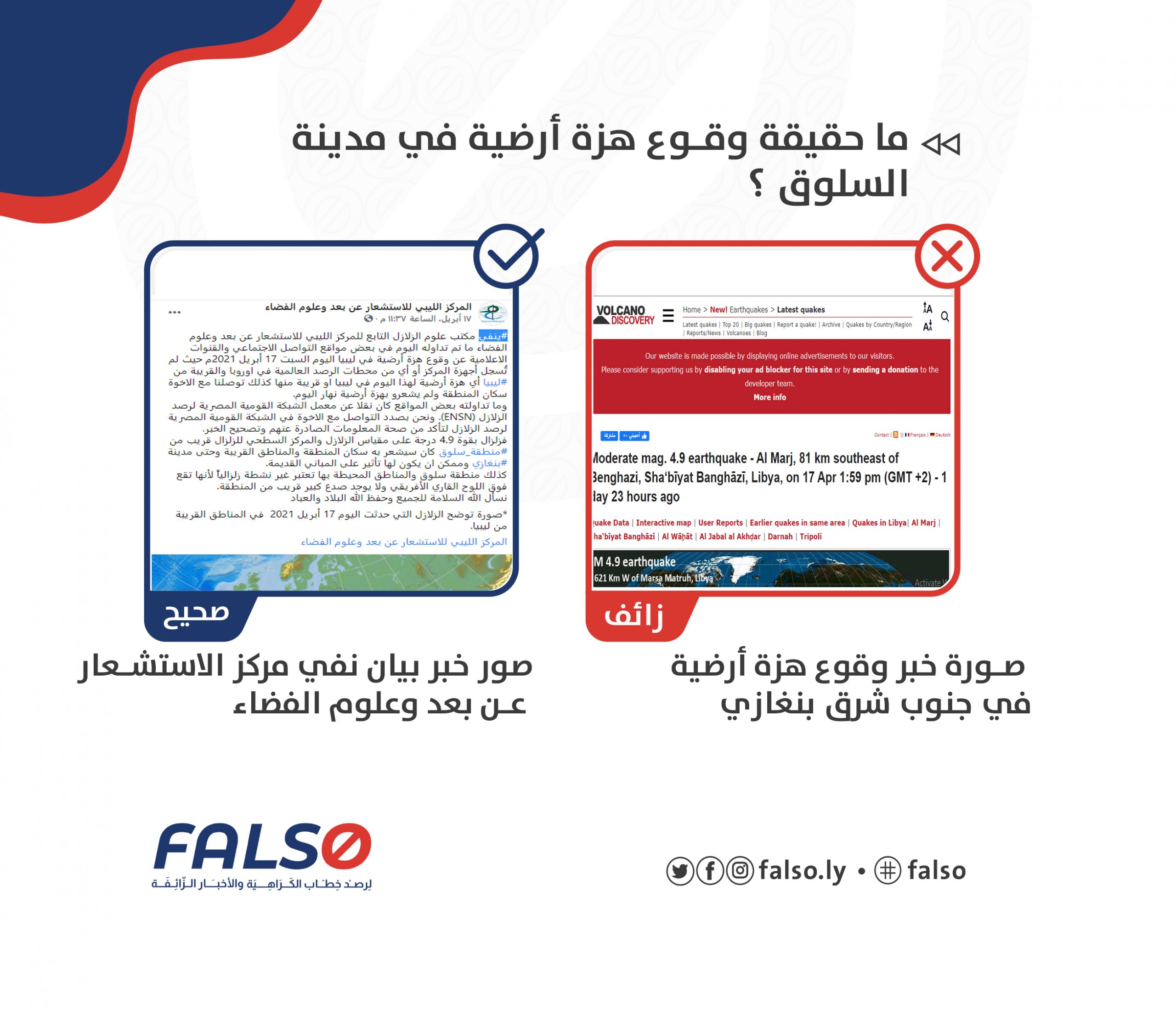 نشر موقع ” Volcano discovery” ادعاء زائف في تاريخ 17 إبريل 2021 مفاده “متوسط ماج. زلزال 4.9 – المرج ، 81 كم جنوب شرق بنغازي ، شعبيات بنغازي ، ليبيا ، في 17 أبريل 1:59 مساءً (GMT +2) – منذ يوم واحد و 23 ساعة” . ❌❌