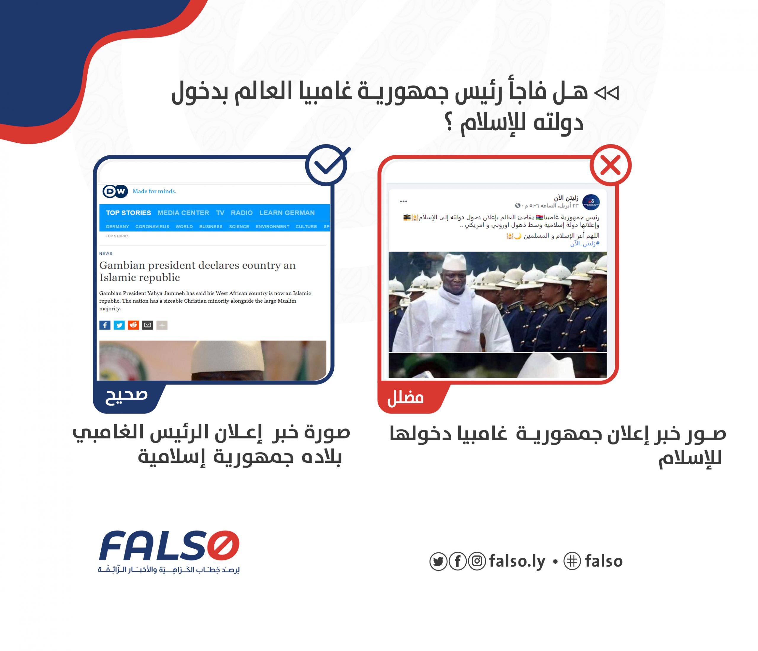 نشرت صفحة “زليتن الآن” على الفيس بوك ادعاء  مضللاً في تاريخ 23 إبريل 2021 مفاده  “رئيس جمهورية غامبيا يفاجئ العالم بإعلان دخول دولته إلى الإسلام وإعلانها دولة إسلامية وسط ذهول أوروبي وامريكي.. اللهم أعز الإسلام والمسلمين   #زليتن_الآن” وحظي الادعاء بتفاعل (7.700 تفاعلات , 1000 تعليقات , 210 مشاركات) ❌❌