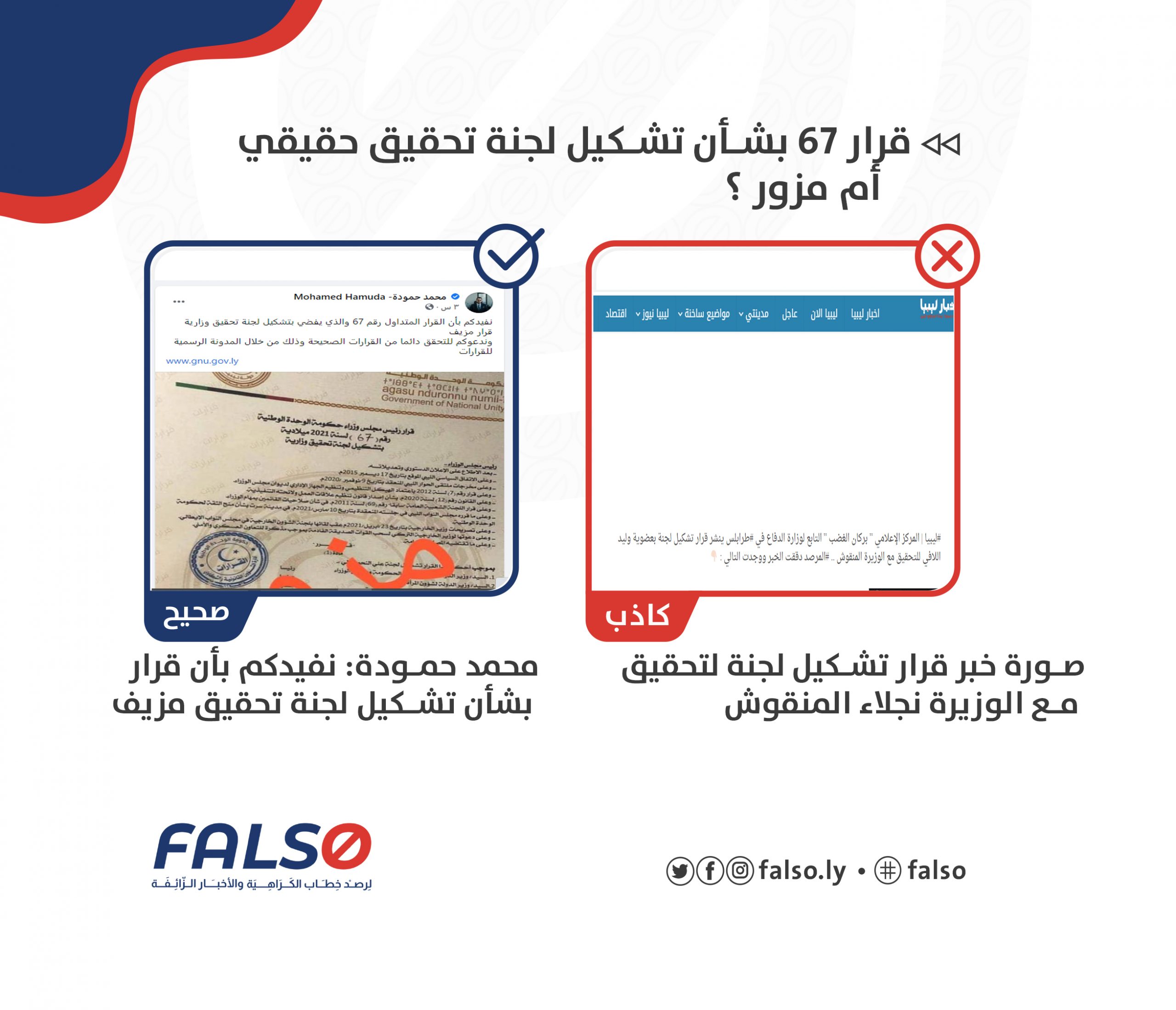 نشرت صفحة  “المركز الإعلامي لعملية بركان الغضب ” على  الفيس بوك  بتاريخ 9 مايو 2021 خبراً كاذبا  مفاده عاجل رئيس مجلس وزراء حكومة الوحدة الوطنية يشكل لجنة وزارية لتحقيق مع وزيرة الخارجية نجلاء المنقوش حيث تم نشر صورة للقرار ويحمل رقم 67 ، الخبر تم تداوله عبر صفحات إعلامية عدة   ❌❌