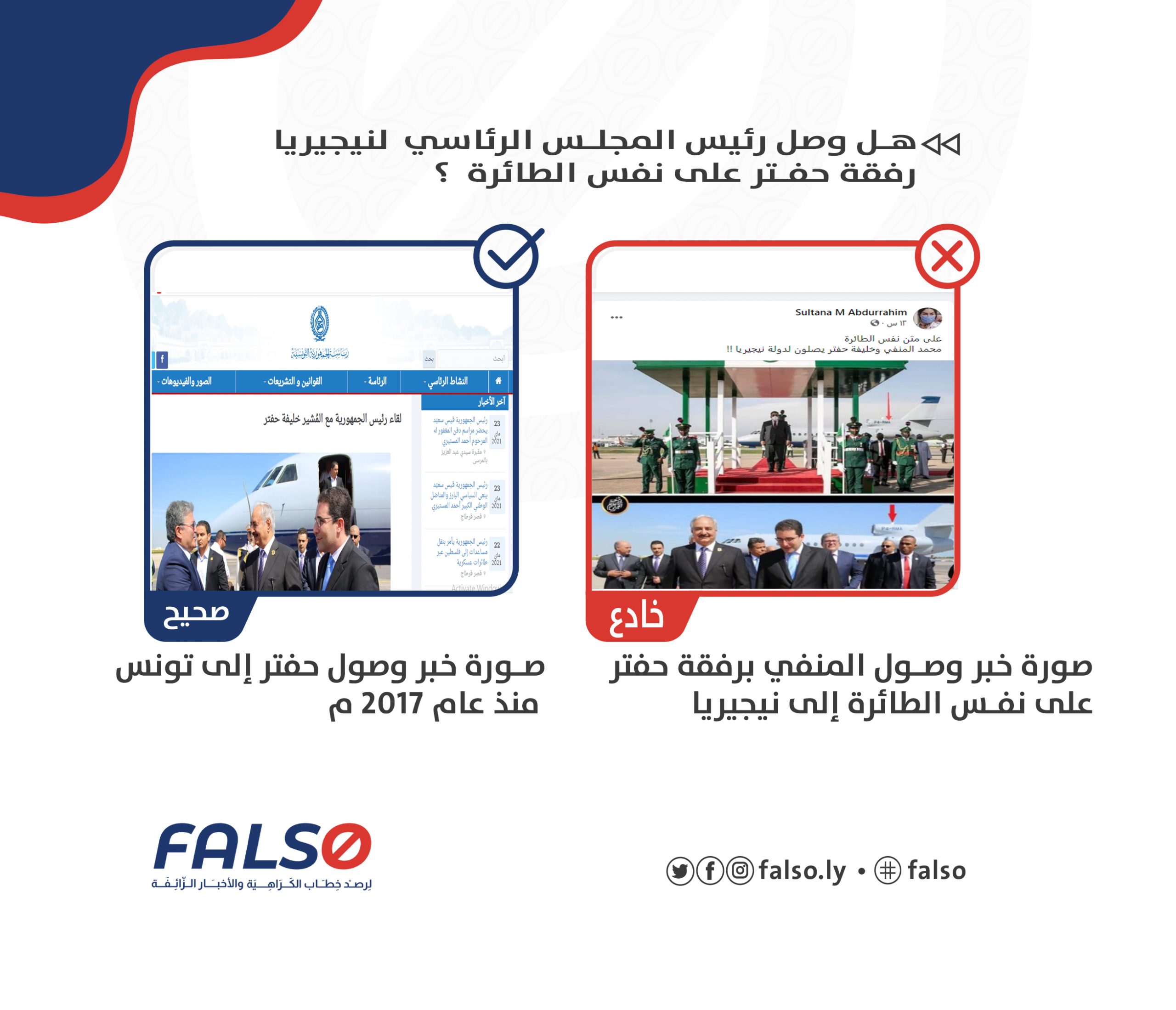 نُشر عبر الصفحة الشخصية للناشطة ” Sultana M Abdurrahim ” على الفيس بوك بتاريخ 24 مايو خبراً خادعاً مفاده وصول الجنرال خليفة حفتر على متن نفس الطائرة التي أقلت رئيس المجلس الرئاسي محمد المنفي إلي العاصمة النيجيرية أبوجا لحضور مؤتمر دول حوض بحيرة تشاد ، والخبر حظي على عدد 383 تفاعلا وعدد 50 من التعليقات وعلى عدد 37 مشاركة ❌❌
