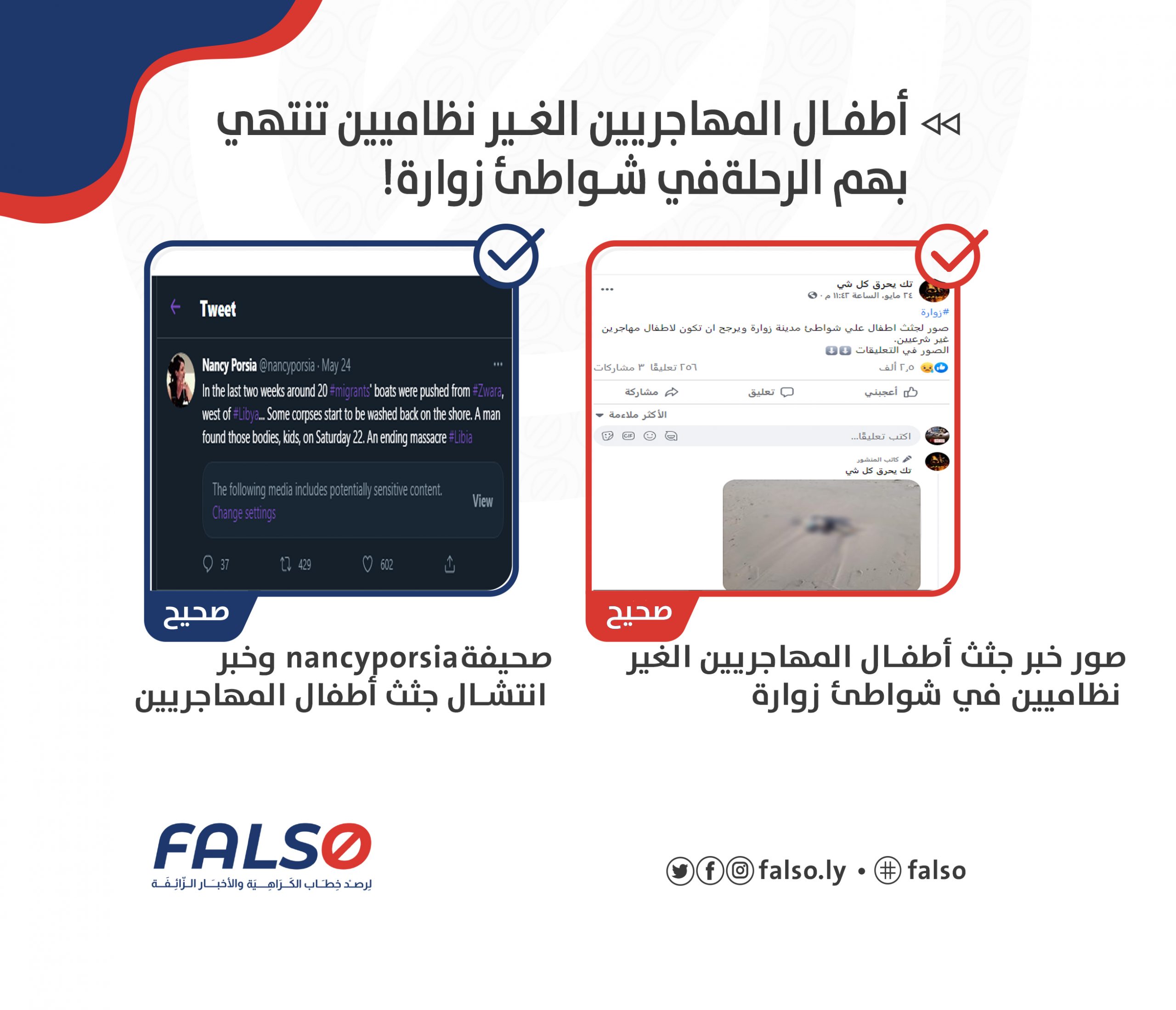 نُشر عبر صفحة تك يحرق كل شيء على الفيس بوك بتاريخ 24 مايو 2021 خبراً مفاده صور لجثث أطفال علي شواطئ مدينة زوارة ويرجح ان تكون لأطفال مهاجرين غير شرعيين، والخبر حظي على عدد 2500 تفاعلا وعدد 53 2من التعليقات وعلى عدد 3 مشاركات ✅✅