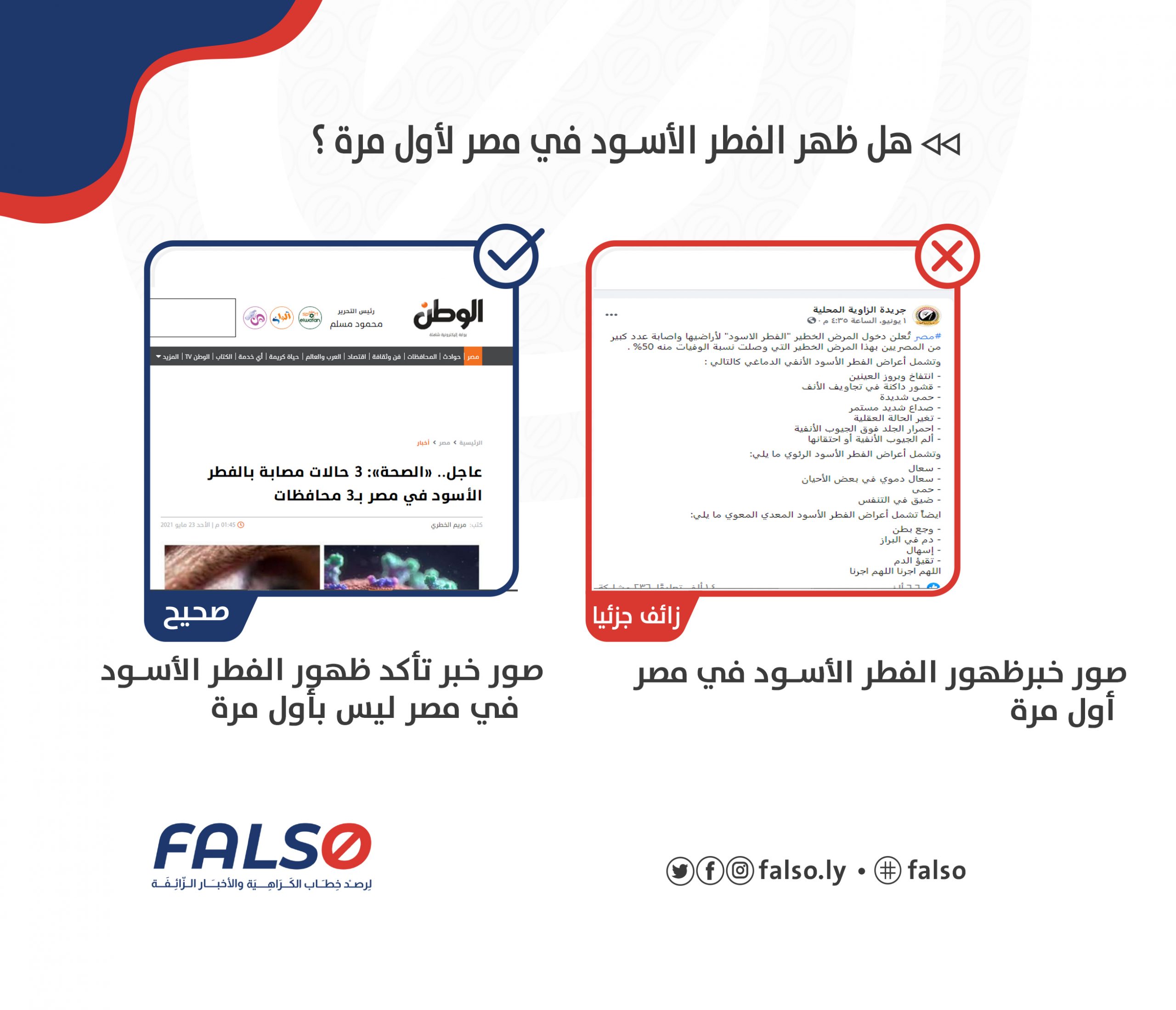 نشر على صفحات مواقع التواصل الاجتماعي فيس بوك الليبية خبرا زائف جزئيا  عن ((إعلان مصر دخول المرض الخطير الفطر الأسود الخطير لأراضيها وإصابة عدد كبير من المصريين بهذا المرض الخطير التي وصلت نسبة الوفيات منه 50% . )) .