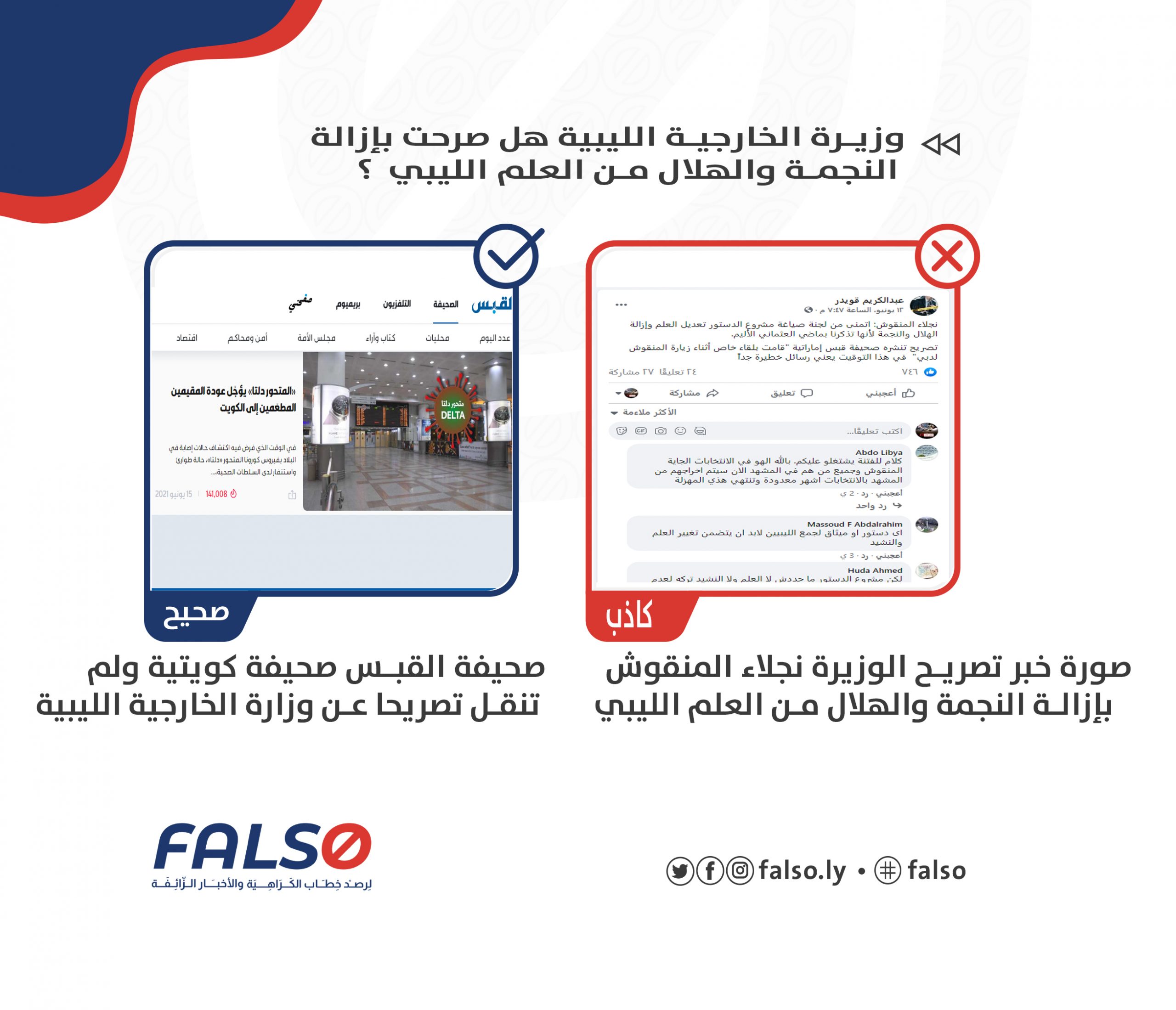 نشر عبر الحساب الشخصي ل “ عبدالكريم قويدر” في الفيس بوك خبرا كاذبا مفاده وهو نقل تصريح لوزيرة الخارجية الليبية نجلاء المنقوش والتي صرحت : أتمنى من لجنة صياغة مشروع الدستور تعديل العلم وإزالة الهلال والنجمة لأنها تذكرنا بماضي العثماني الأليم.