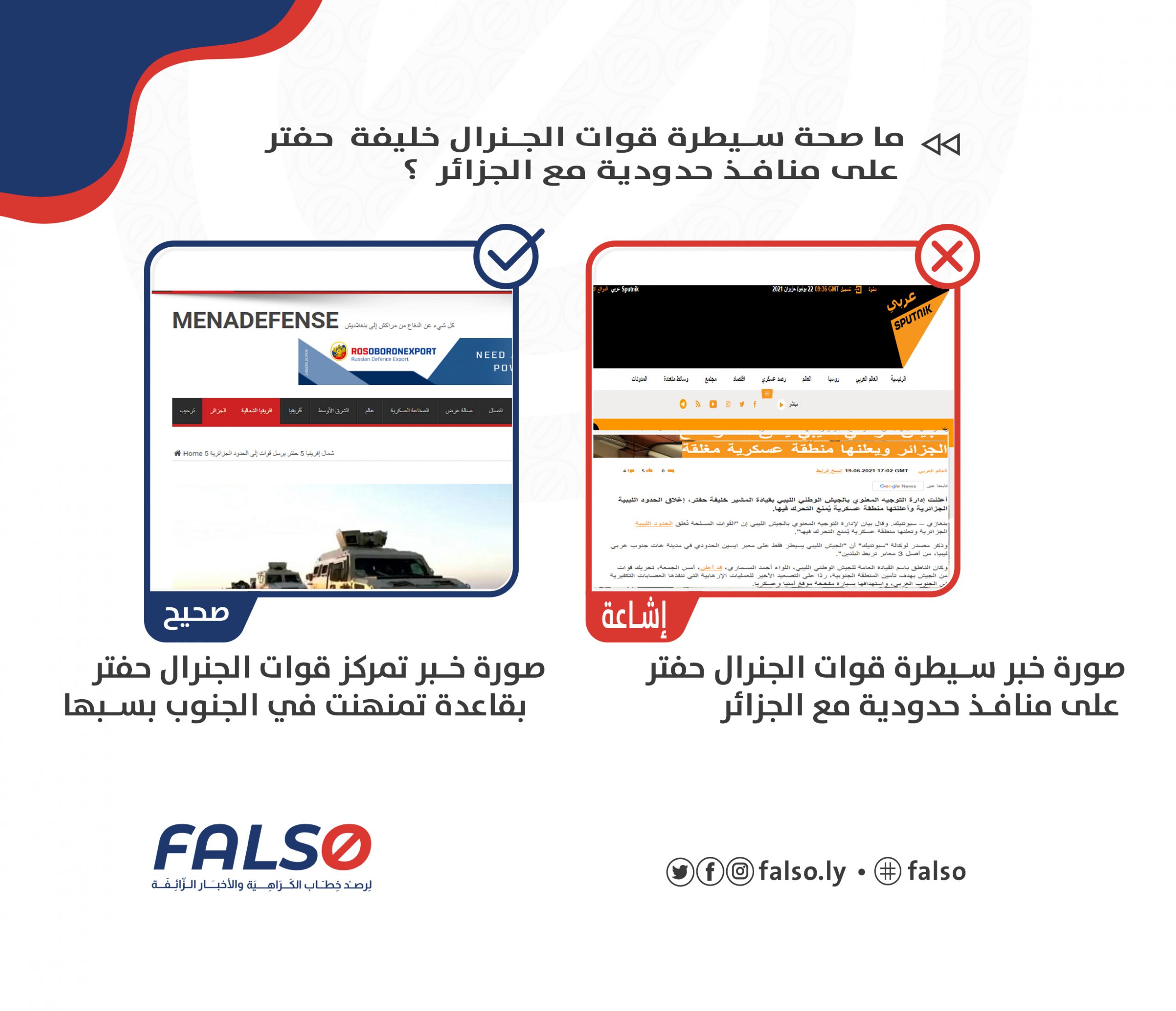 نتشر عبر الموقع الإخباري  “عربي SPUTNIK”  بتاريخ 19 يونيو 2021 إشاعة  مفادها ” أعلنت إدارة التوجيه المعنوي بالجيش الوطني الليبي بقيادة المشير خليفة حفتر، إغلاق الحدود الليبية الجزائرية وأعلنتها منطقة عسكرية يُمنع التحرك فيها الموقع الإخباري نشر الصور والفيديو دون التحري والتحقق من صحة المعلومات المنشورة .❌❌