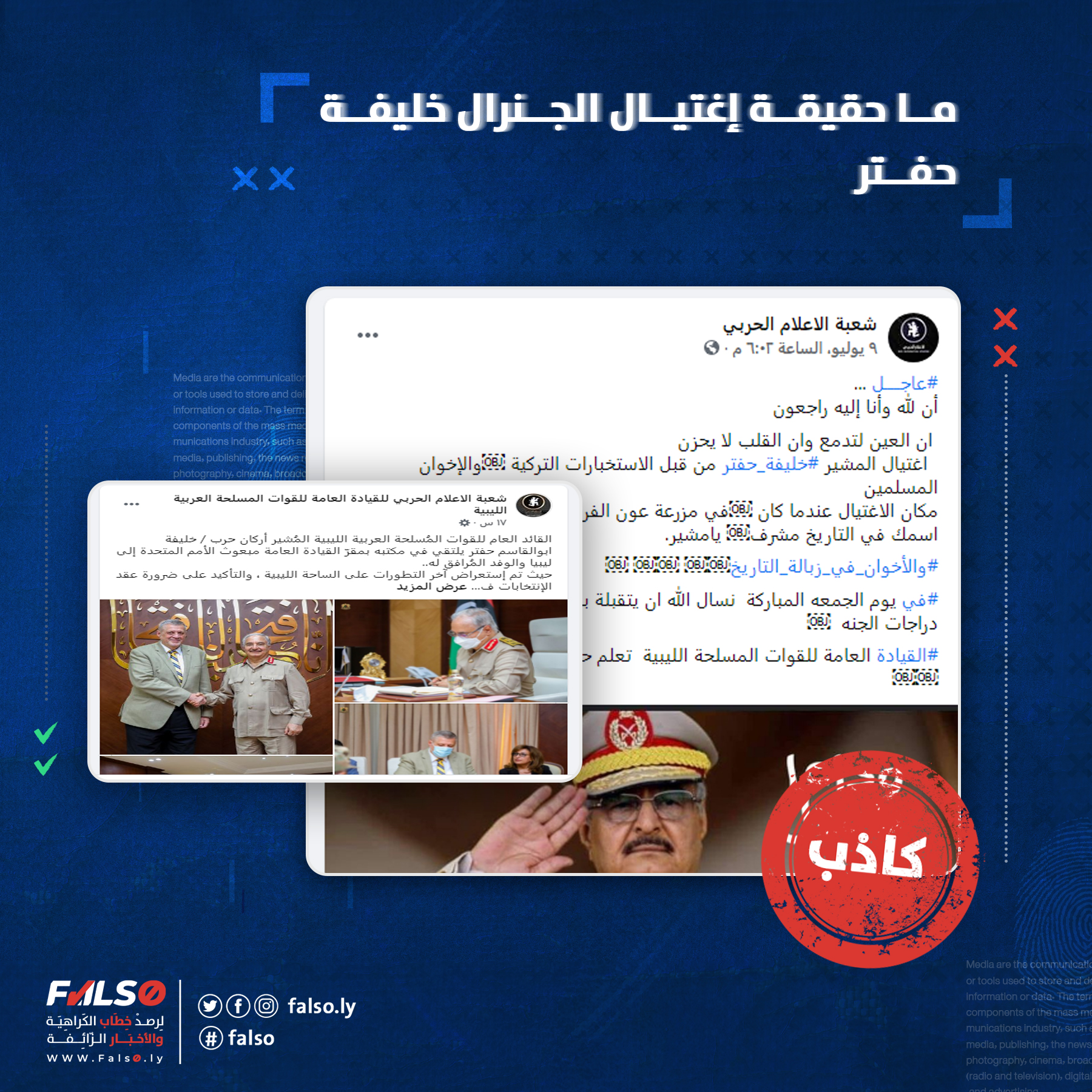 • من خلال التقصي والتتبع والبحث توصل فريق فالصو إلى أن الخبر كاذب وأن الخبر نشر بدون مصدر وكذلك عدم تفاعل وسائل الإعلام ووسائل الاتصال المختلفة مع الخبر على اعتبار أن شخصية الجنرال خليفة حفتر بارزة ومعروفة كما إن الصفحة التي تحمل اسم شعبة الإعلام الحربي التي صدر فيها خبر الاغتيال مزيفة وليست الصفحة الرسمية التي تحمل نفس الاسم.