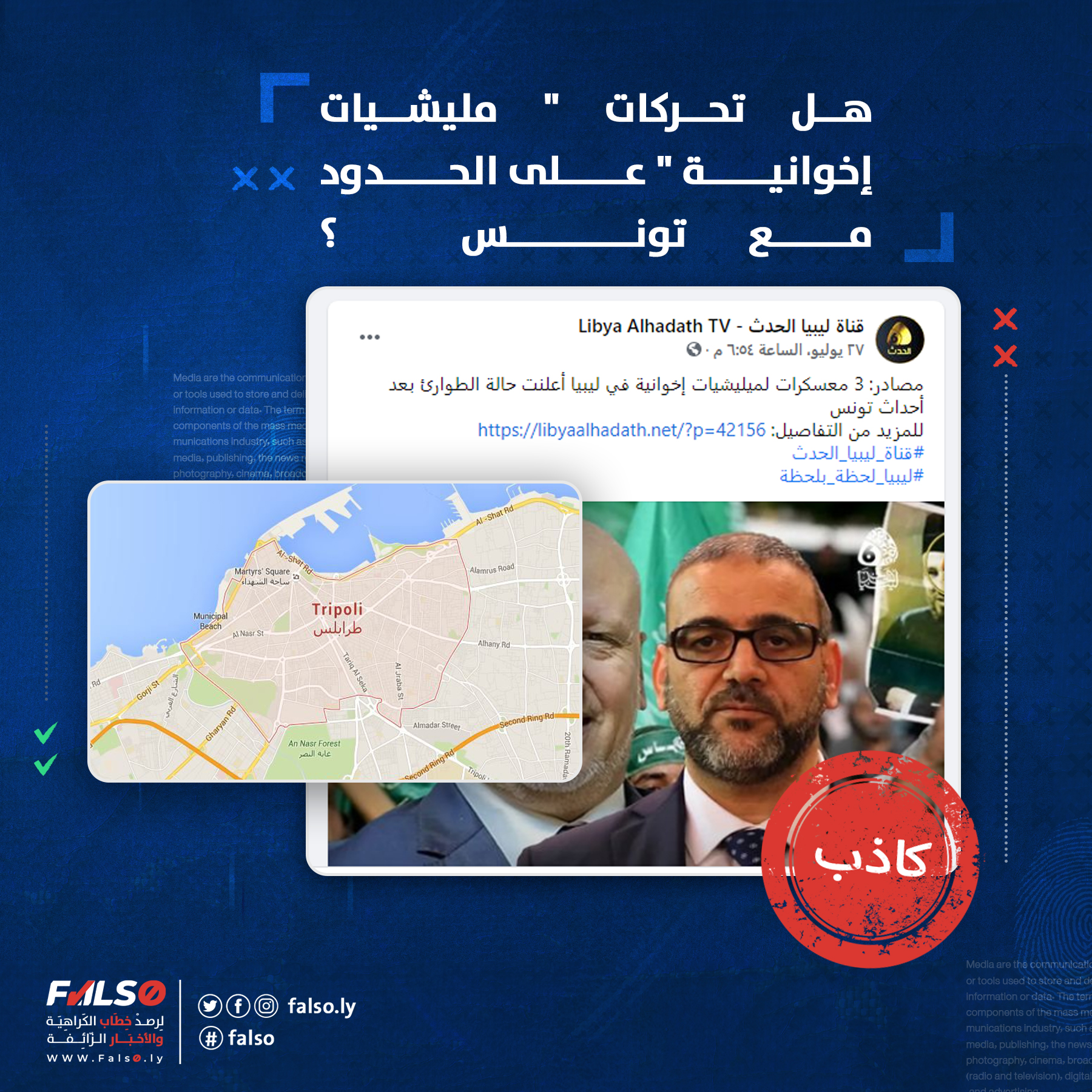 نشرت الصفحة الرسمية لقناة ليبيا الحدث خبراً كاذباً بهدف منه إثارت البلبلة والفتنة ، من مصادر تزعم إن 3 معسكرات تتبع ما أسمتهم ” مليشيات إخوانية ” في طرابلس أعلنت حالة الطوارئ عقب التدابير الإستثنائية التي إتخذها الرئيس التونسي قيس سعيد ، دون أي إشارة لمصدر هذه المزاعم ، وقد حصد الخبر على عدد .811 تفاعلا 126 تعليق 20 مشاركة .