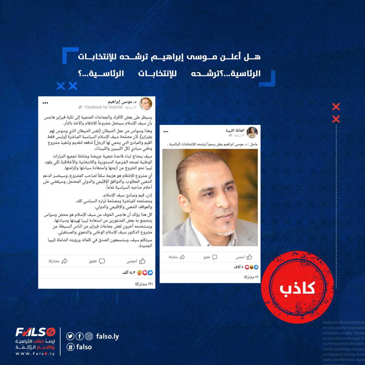 بعد التحقق والتدقيق في محركات البحث من قِبل فريق منصة فالصو عن أي تصريح أو مقابلة لموسى إبراهيم عن نيته الترشح للانتخابات فللم نجد أي شيء يؤكد هذا الأمر بالإضافة الي الرجوع للشخصية المعنية بهذا الزمر وهو “موسى إبراهيم”، فإن صفحته الرسمية لم يكن فيها أي تصريح بنيته خوض الانتخابات الرئاسية، كما أنه كتب منشورا بصفحته بعد هذا الادعاء بساعات قليلة كان يدعم فيها ترشح سيف الإسلام للرئاسة.