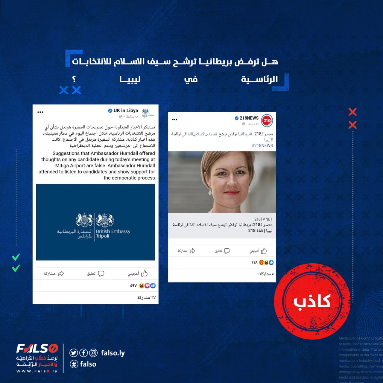 نشر موقع 218 NEWS على الإنترنت خبر مفاده أن بأن السفيرة البريطانية لدى ليبيا كارولاين هرندل، أكدت خلال “اجتماع معيتيقة” اليوم عن رفضها ترشح سيف الإسلام القذافي للانتخابات الرئاسية بتاريخ 17/11/2021 وحظي الادعاء بتفاعلٍ كبير بمشاركته في صفحة 218 NEWS على الفيس بوك حيث بلغ تفاعل المنشور في الصفحة نفسها بأكثر من 233 إعجاب و100 تعليق و3 مشاركات .