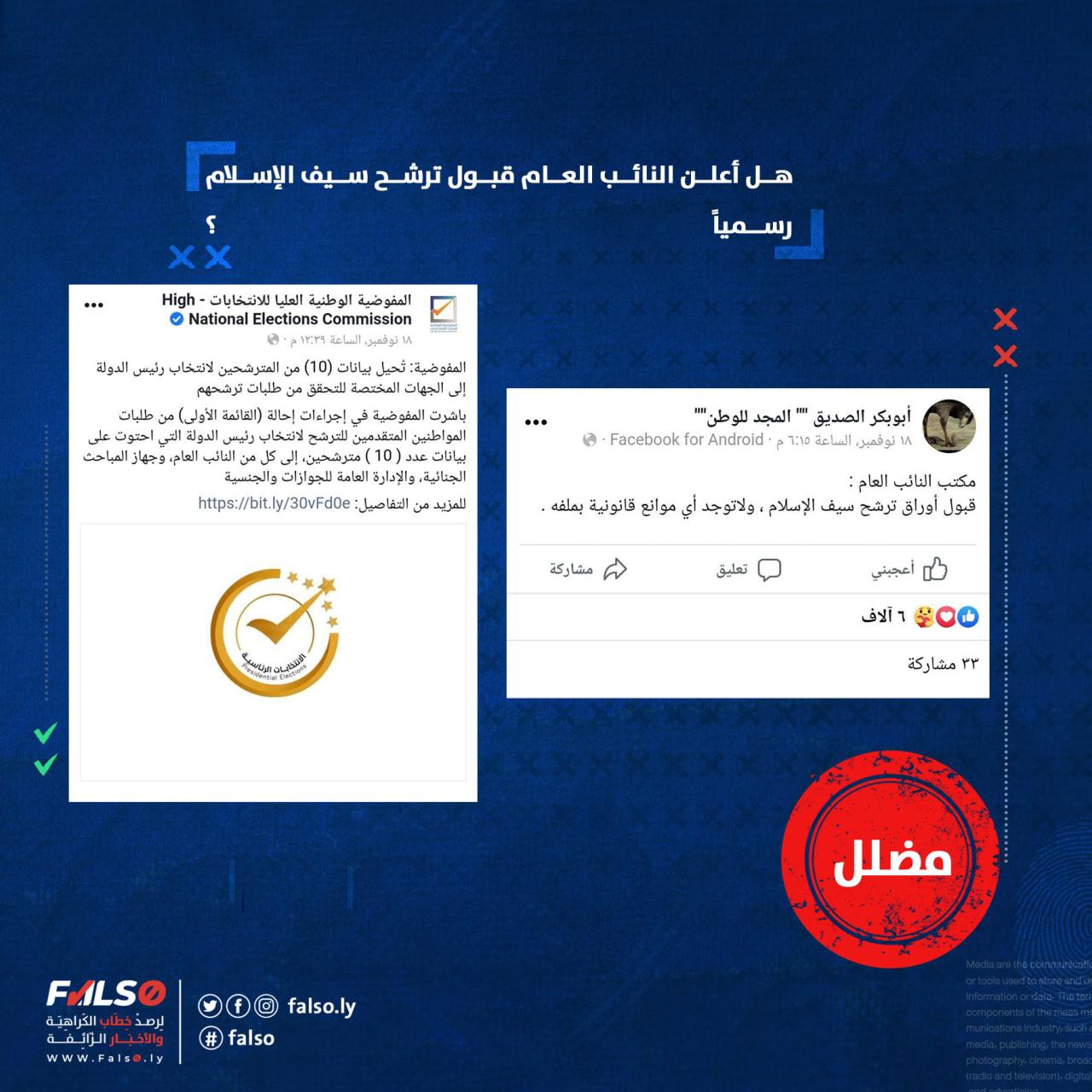 نشرت صفحة أبوبكر الصديق “” المجد للوطن”” بتاريخ 18 نوفمبر إدعاءً جاء فيه “مكتب النائب العام : قبول أوراق ترشح سيف الإسلام ، ولاتوجد أي موانع قانونية بملفه”. وحظي الادعاء بتفاعلٍ كبير في الصفحة ، حيث بلغ تفاعل المنشور في الصفحة نفسها بأكثر من 5000 إعجاب و129 تعليق و32 مشاركة فضلا عن صفحات وحسابات شخصية أخرى شاركت ذات المنشور منها صفحة (ليبيا مباشر) .