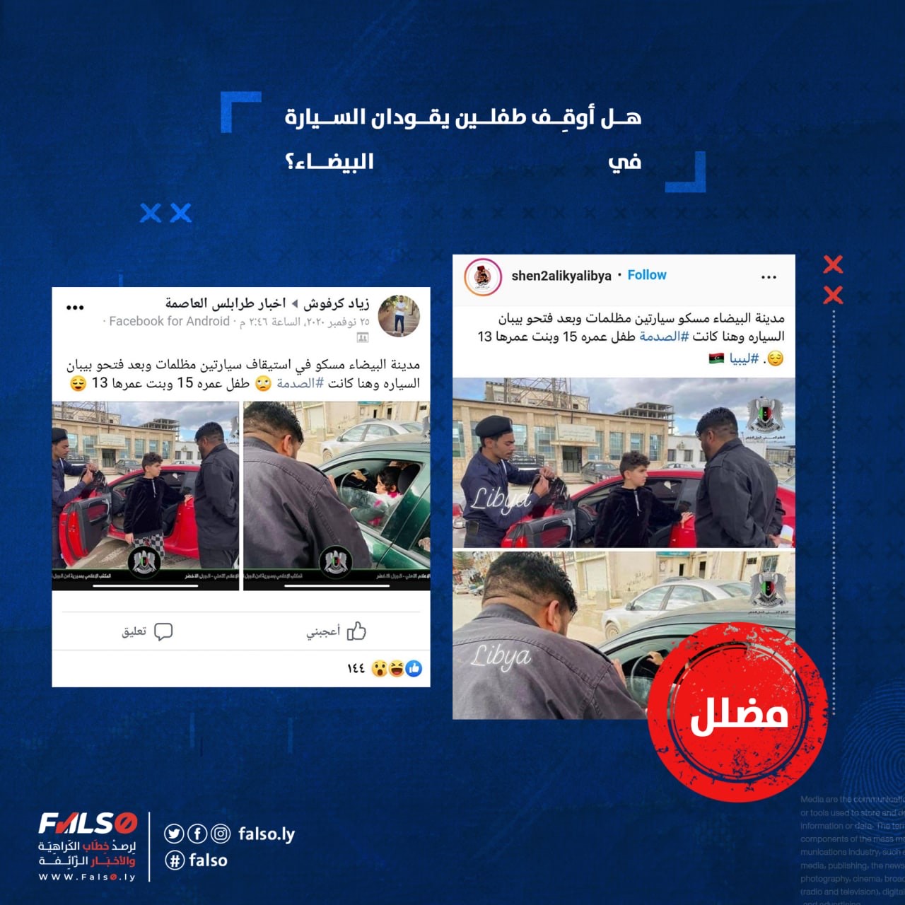 نشر حساب “شن حالك يا ليبي” عبر إنستغرام خبراً مفاده إن عناصر من الشرطة في مدينة البيضاء شرقي ليبيا، قاموا بإيقاف سيارة مٌعتمه بها طفلين ” ولد ذو 15 سنة ، وبنت ذو 13 سنة ” وذلك بتاريخ 25 نوفمبر الماضي .