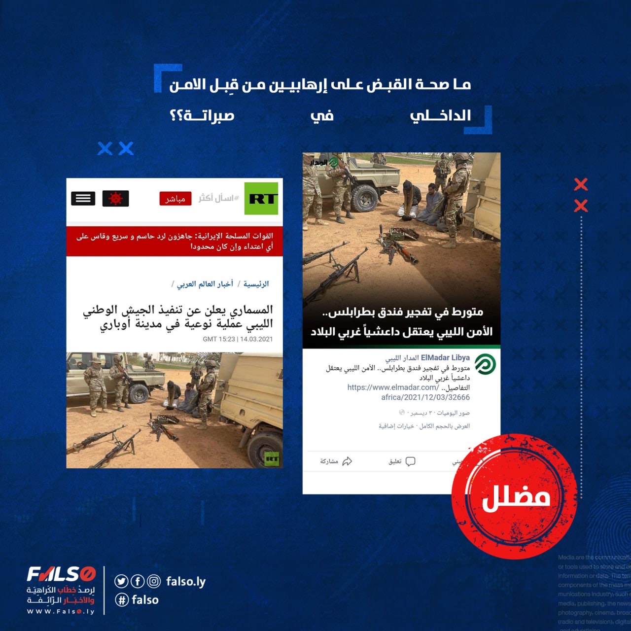 وعند الاطلاع على جميع النتائج نجد أن الخبر الذي نشرته موقع المدار الليبي وصفحة جهاز الأمن الداخلي خبراً مٌضللاً ولا أساس له من الصحة، فيما يعود الفيديو الذي نشرته الأخيرة يعود لعنصر مٌتهم بالتعاون وتسهيل حركة مرور عناصر تنظيم الدولة، وقٌبض عليه في سيارته دون أي أسلحة خلف مديرية الأمن بلدية صبراتة فضلاً عن كون الصورة التي تم نشرها بموقع المدار الليبي يعود لعنصر من تنظيم الدولة أخر قبض عليه ببلدة اوباري جنوب ليبيا .