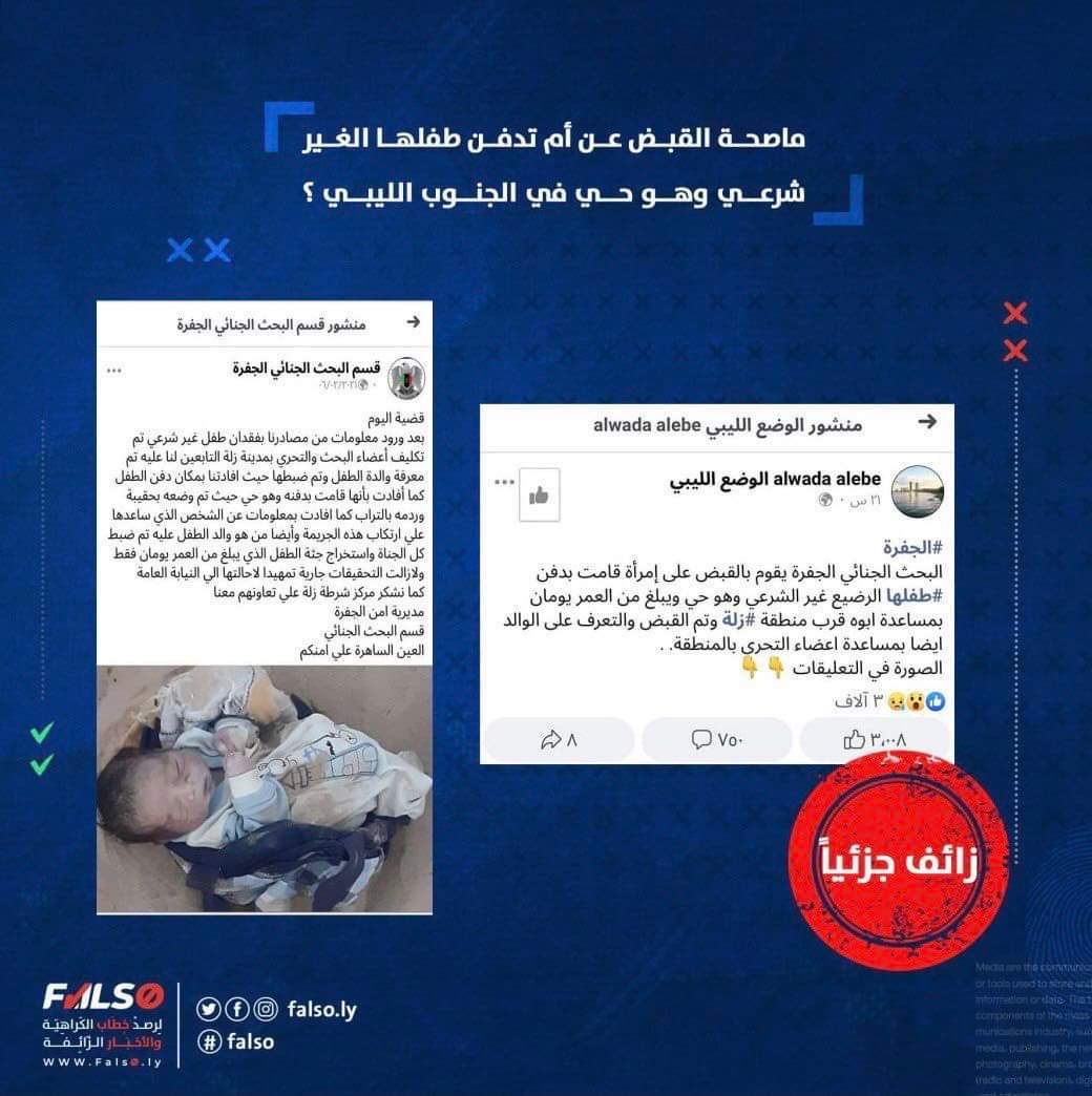 حيث تبين من خلال البحث العكسي والتحقق من ان الخبر صحيح ولكنه خبر قديم كان قد نشرالسنة الماضية في الصفحة الرسمية للبحث الجنائي الجفرة بتاريخ 5 فبراير 2021 ويتم تداول الحادثة الآن على انها جديدة وهذا غير صحيح