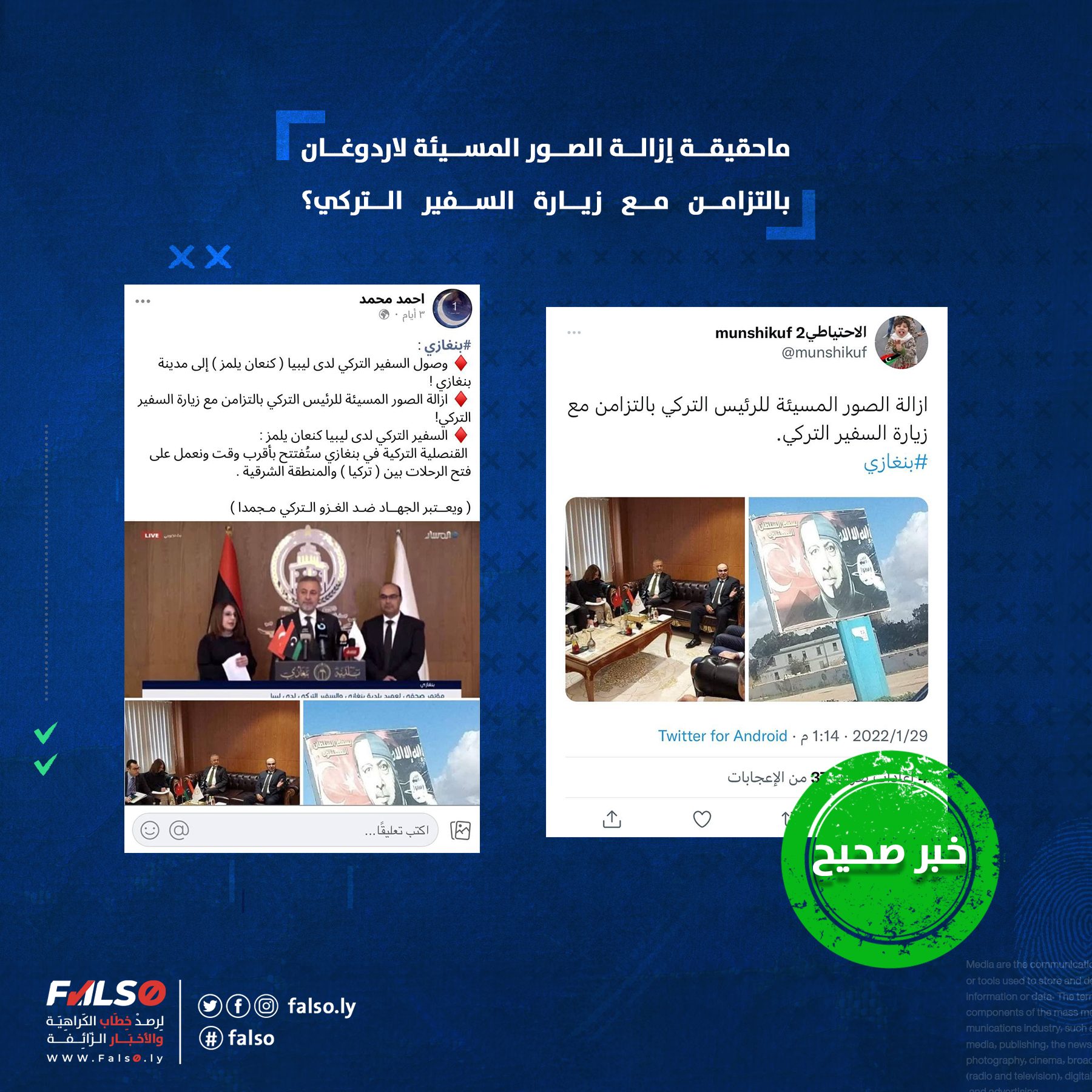 انتشر خبر إزالة الصور المسيئة للرئيس التركي بالتزامن مع زيارة السفير إلى مدينة بنغازي في العديد من الصفحات ومن قبل روّاد التواصل الاجتماعي على فيسبوك وتويتر حيث نشر حساب احمد محمد ا ادعاء جاء فيه :
