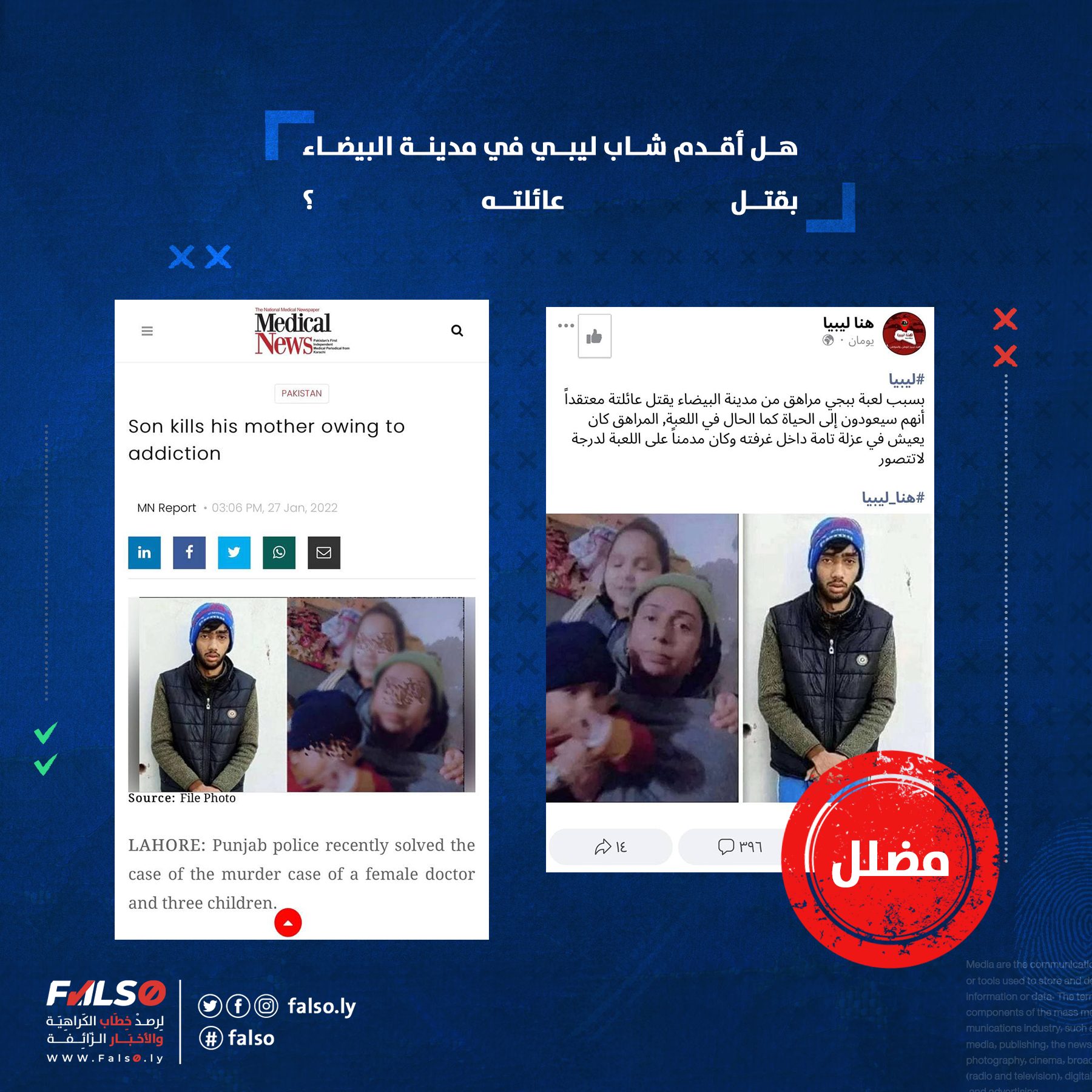 حيث نشرت صفحة باسم “هنا ليبيا” الخميس بتاريخ 3 فبراير 2022 الادعاء التالي “#ليبيا بسبب لعبة ببجي مراهق من مدينة البيضاء يقتل عائلتة معتقداً أنهم سيعودون إلى الحياة كما الحال في اللعبة٫ المراهق كان يعيش في عزلة تامة داخل غرفته وكان مدمناً على اللعبة لدرجة لا تتصور #هنا_ليبيا ”