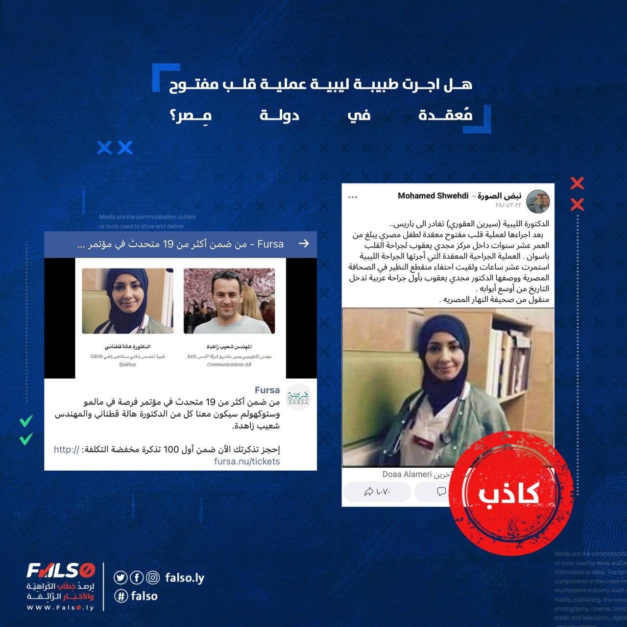 نشر حساب شخصي يٌدعي محمد الشاوش في مجموعة تٌسمي نبض الصورة عبر موقع فيسبوك ادعاء كاذب بتاريخ 28 يناير الماضي مفاده كا التالي (الدكتورة الليبية سيرين العقوري تغادر الى باريس بعد اجرائها لعملية قلب مفتوح معقدة لطفل مصري يبلغ من العمر عشر سنوات داخل مركز مجدي يعقوب لجراحة القلب بأسوان. العملية الجراحية المعقدة التي أجرتها الجراحة الليبية استمرت عشر ساعات ولقيت احتفاء منقطع النظير في الصحافة المصرية ووصفها الدكتور مجدي يعقوب بأول جراحة عربية تدخل التاريخ من أوسع أبوابه) ويزعم أن الخبر منقول من صحيفة النهار المصرية.