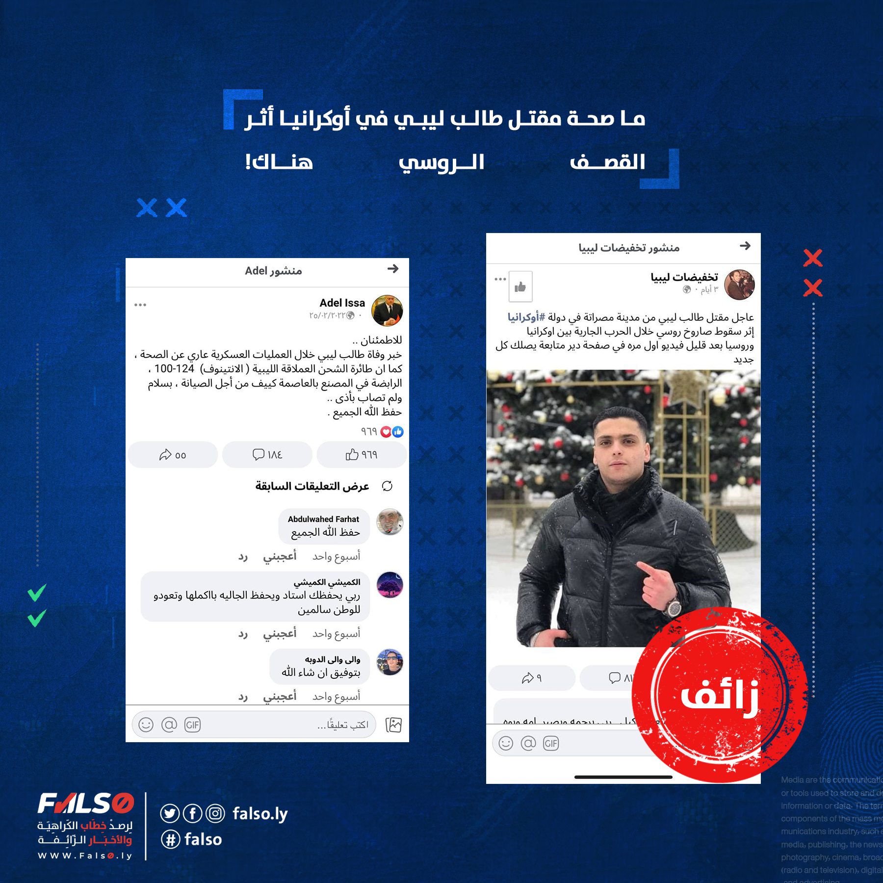 تناقلت العديد من الصفحات عبر موقع فيسبوك ادعاء زائف مفاده مقتل طالب ليبي في دولة أوكرانيا نتيجة قصف صاروخي نفذه الجيش الروسي على مدينة ماريوبول بالجزء الجنوبي الشرقي لدولة أوكرانيا.