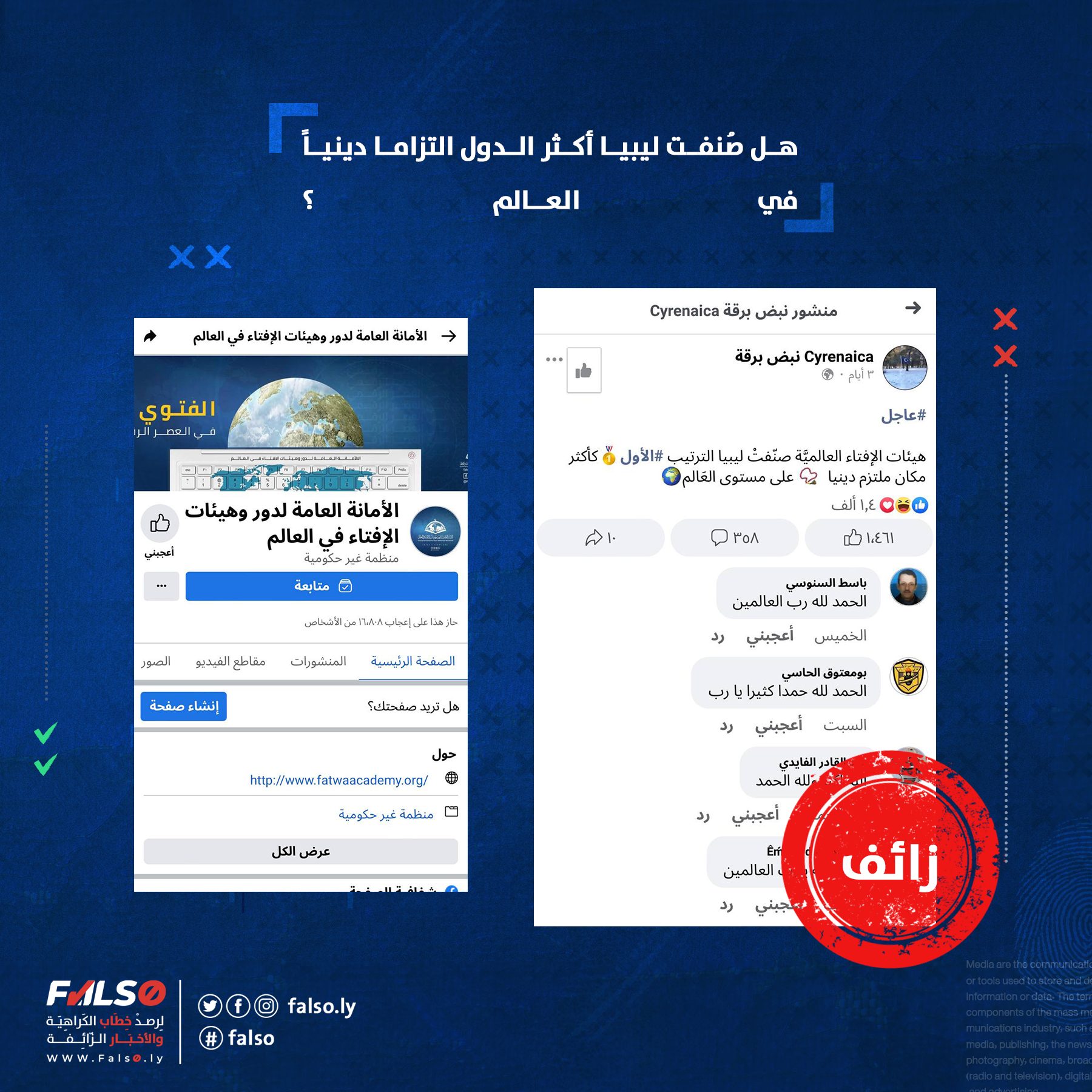 نشرت صفحة عامة بموقع فيسبوك تٌسمي ” نبض برقة ” ادعاء زائف مفاده إن “هيئات الإفتاء العالمية ” صنفت ليبية كـ أكثر دول العالم التزاما على المستوي الديني، وقد حظي الخبر بأكثـر من 1400 إعجاب وزادت التعليقات عن 356 تعليق و10 مٌشاركات، فيما تم تداوله في العديد من الصفحات الأخرى ليحصد الادعاء الزائف العديد من التعليقات والانتشار.