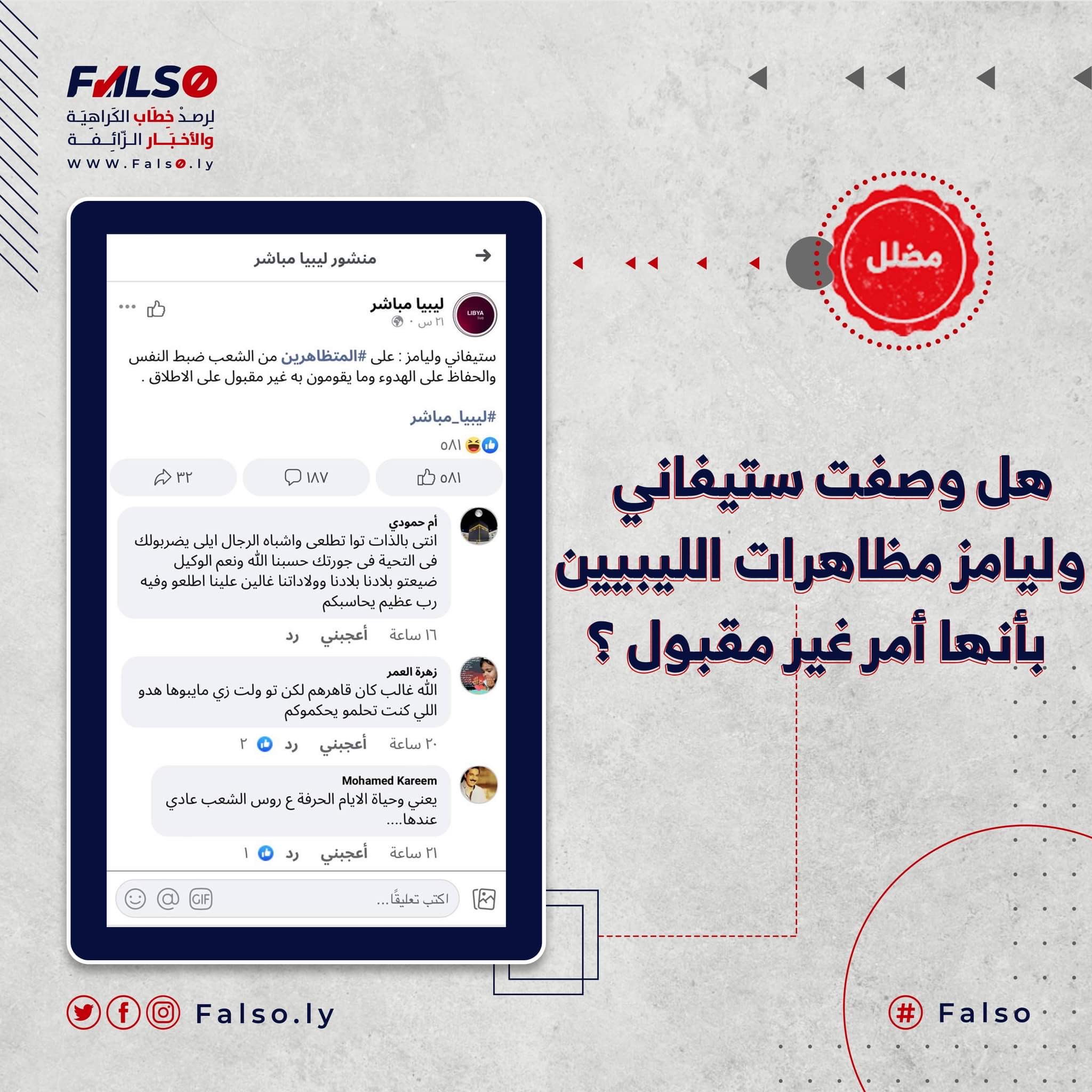 وتبين أن الادعاء مظلل جزئيا وركزت صفحة ليبيا “مباشر” فقط على وصف تغريدة وليامز بوصفها أن المتظاهرين عليهم بضبط النفس وأن ما يقومون به غير مقبول على الإطلاق .