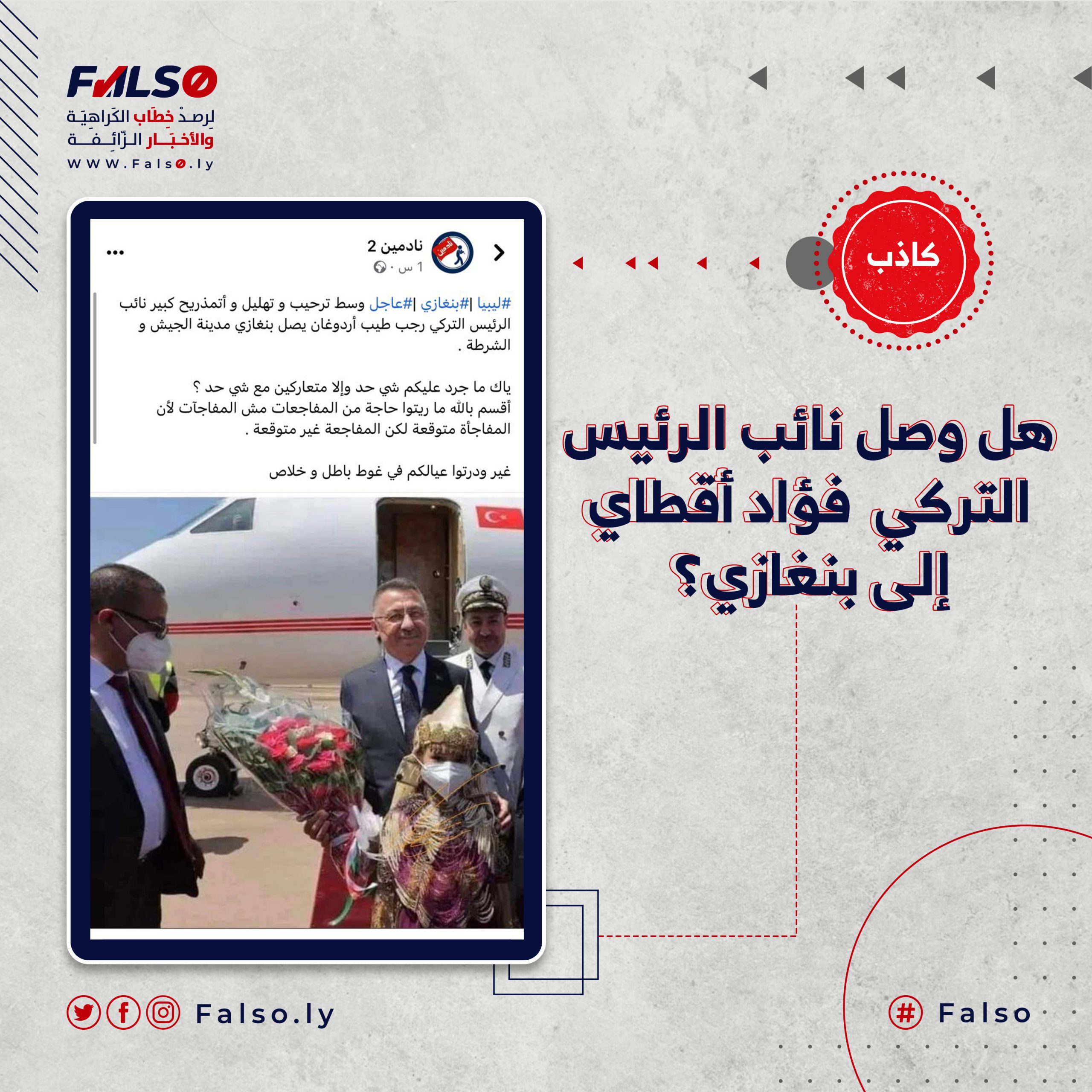 نشرت صفحة بإسم (نادمين 2 ) علي الفيس بوك، والتي يتابعها عدد 8 الاف متابع خبر مفاده وصول وصل نائب الرئيس التركي فؤاد أقطاي إلى بنغازي، حظى المنشور على أكثر ألف تفاعل، وعدد 710 تعليق، وعلى 33 مشاركة، من تاريخ هذا التحقق.