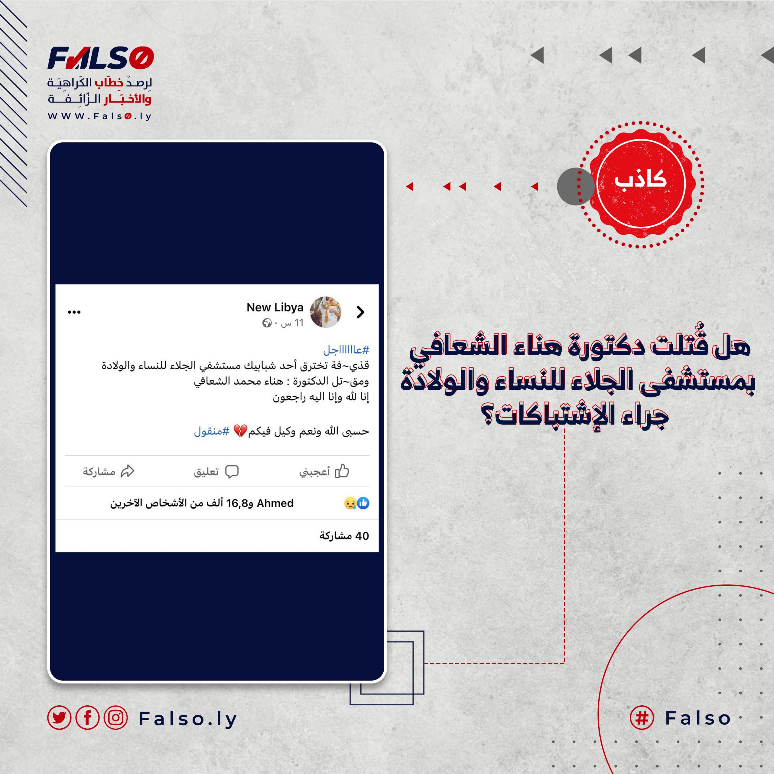 تداولت عدد من صفحات وسائل التواصل الاجتماعي خبر عاجل مفاده مقتل دكتورة بمستشفى الجلاء بشارع عمر المختار طرابلس، حيث تم تداول هذا الخبر عبر صفحة “ليبيا فقط” على موقع فيس بوك المسجلة تحت عنوان شارع عشرين بمدينة بنغازي، كما نشرت الخبر صفحة “New Libya “ كذلك والتي يتابعها أكثر من مليون متابع كما تم نشر الخبر في العديد من المجموعات العامة علي موقع فيس بوك.