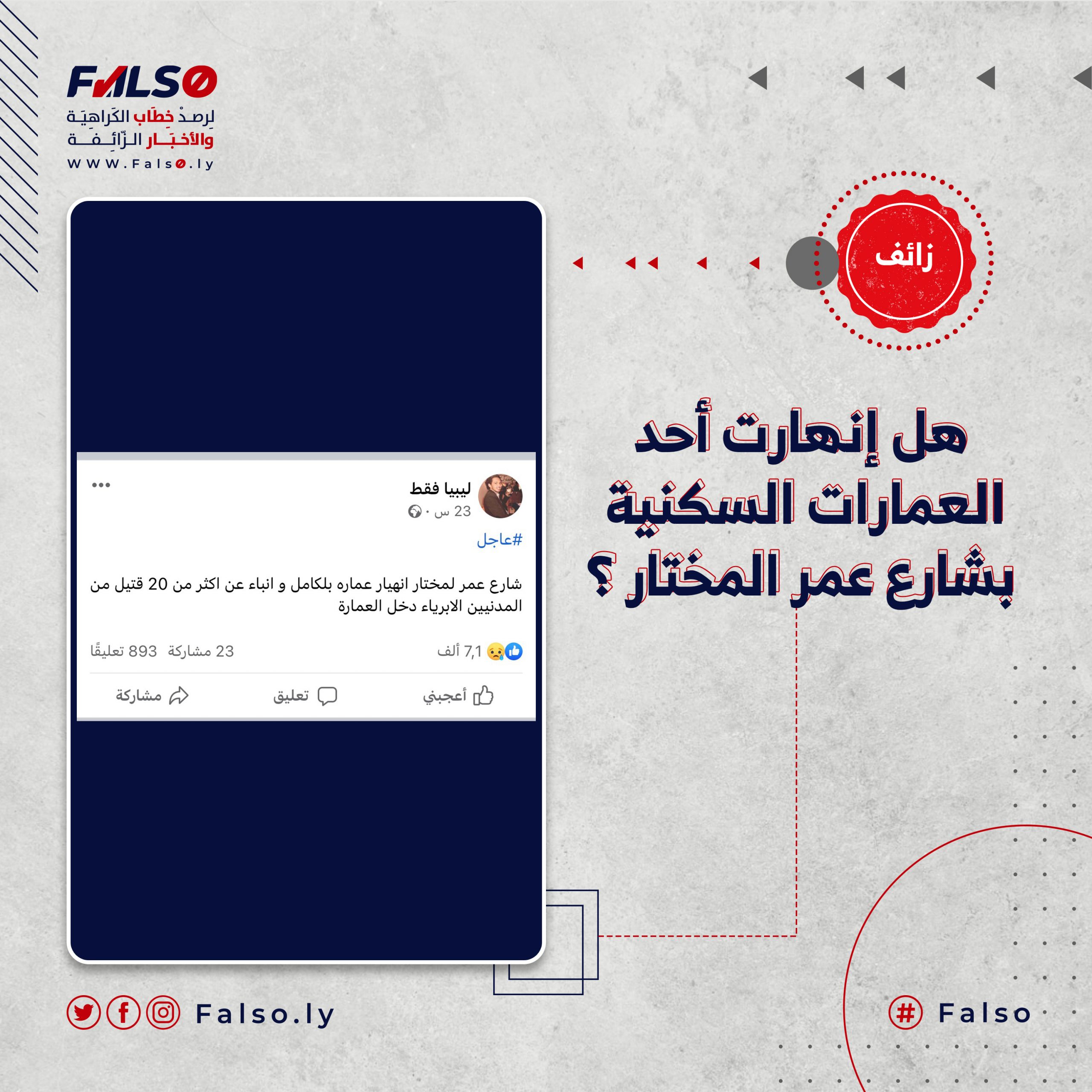 نشرت صفحة باسم “ليبيا فقط” والتي يتابعها أكثر من 170 الف متابع ، الادعاء الاتي، “شارع عمر لمختار انهيار عماره بالكامل و انباء عن اكثر من 20 قتيل من المدنيين الأبرياء دخل العمارة”