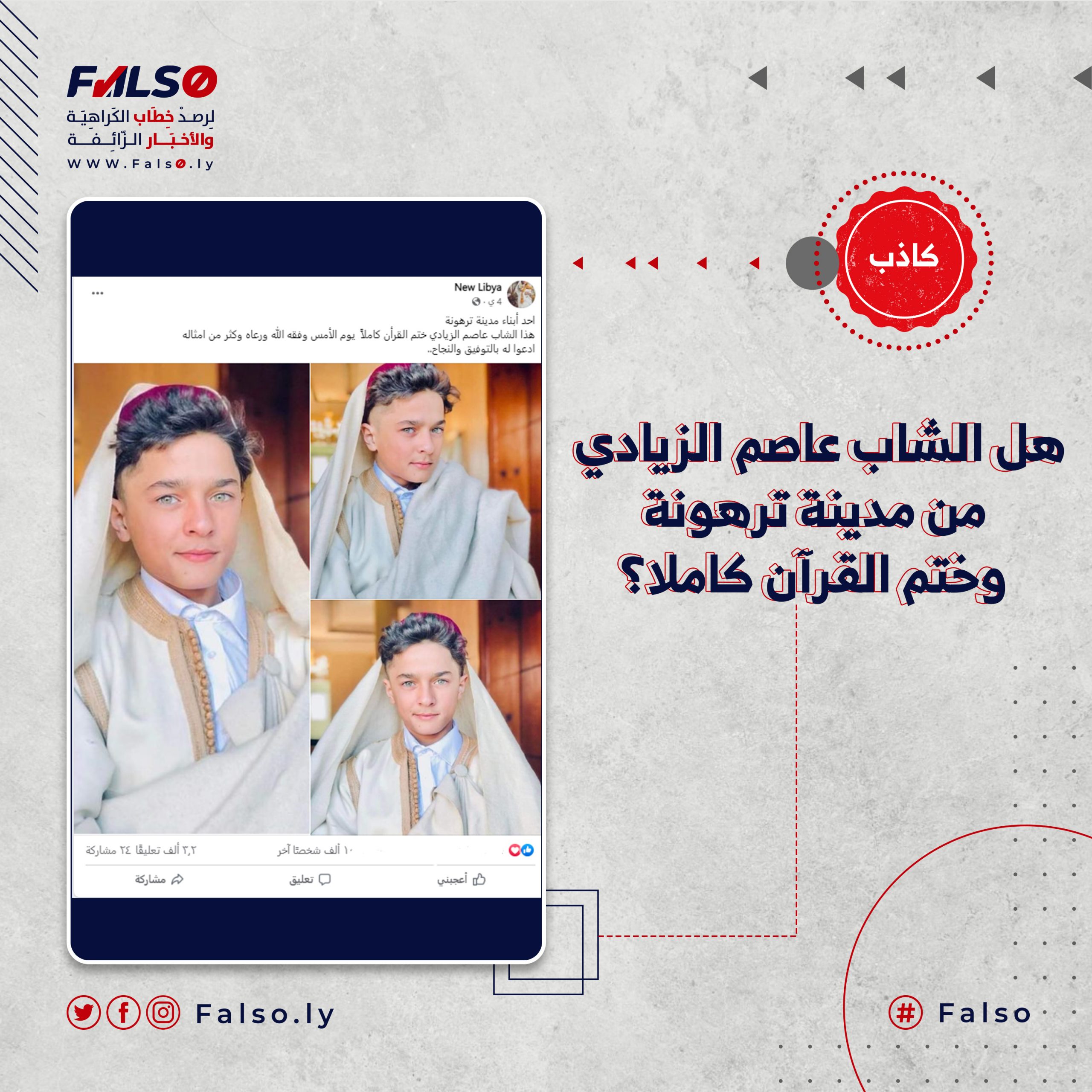 تداولت عدد من الصفحات الالكترونية الليبية احداها صفحة (New Libya) والتي أنشأت سنة 2013 والتي يُديرها 10 أشخاص من ليبيا ويتابعها أكثر من مليون متابع، الادعاء الاتي ”أحد أبناء مدينة ترهونة، هذا الشاب عاصم الزيادي، ختم القرآن كاملا يوم الأمس وفقه الله ورعاه” وقد تحصّل منشور الادعاء خلال يومين على أكثر من 10100 تفاعل و3100 تعليق و23 مشاركة، من تاريخ هذا التحقق.