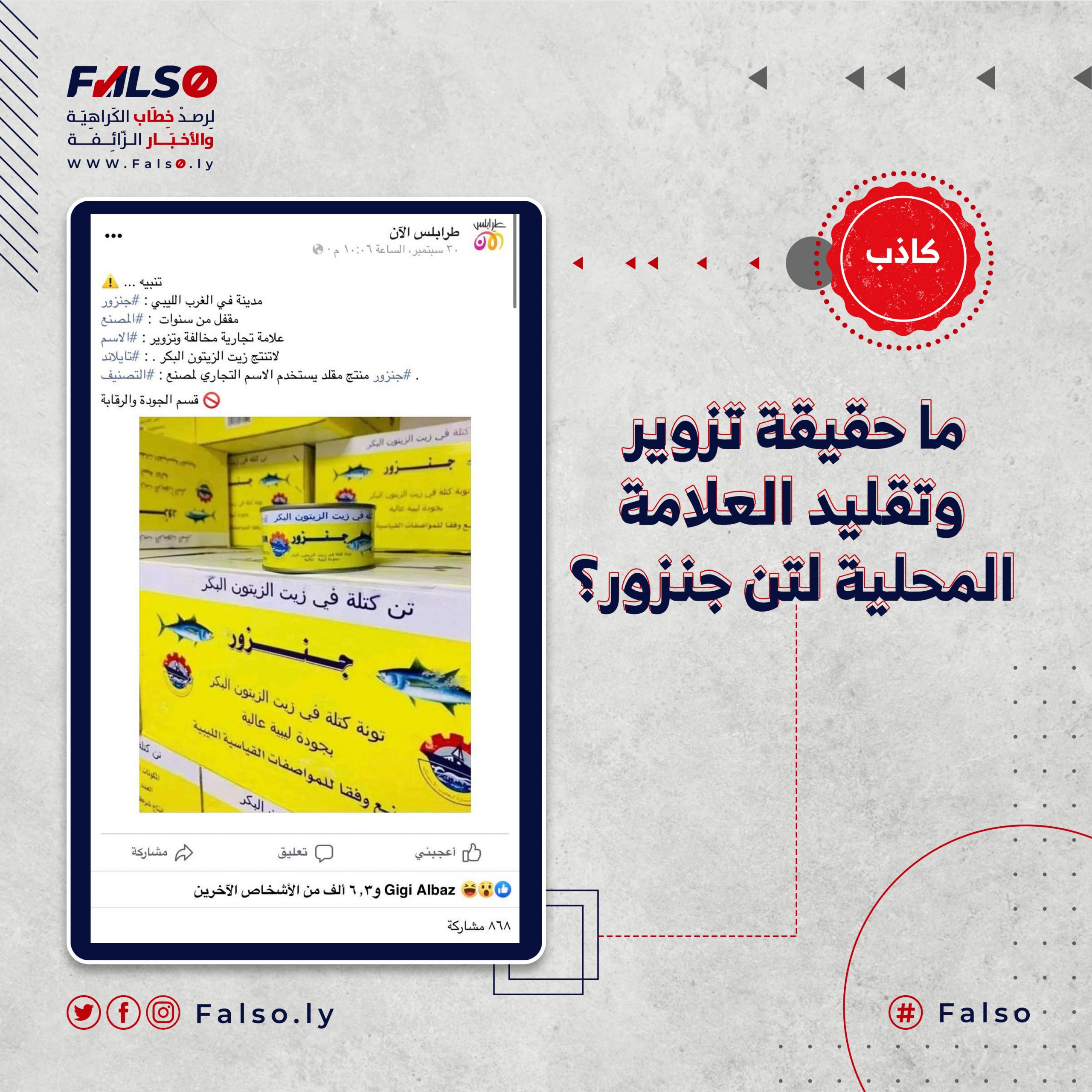تداولت العديد من الصفحات على موقع التواصل الاجتماعي فيس بوك وكان أبرزها صفحة “طرابلس الآن” والتي يتابعها أكثر من 500 ألف والتي تم إنشاؤها سنة 2019 ادعاء مفاده بتزوير العلامة التجارية “تٌن جنزور ” وكان كالآتي :