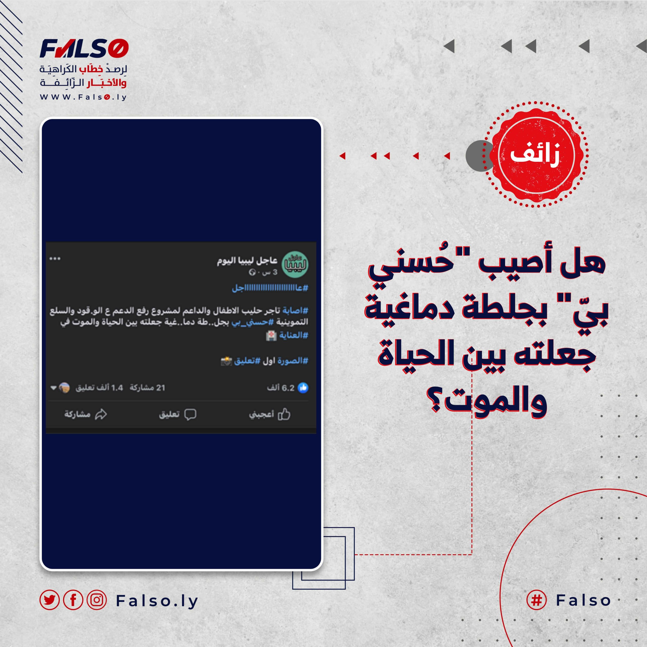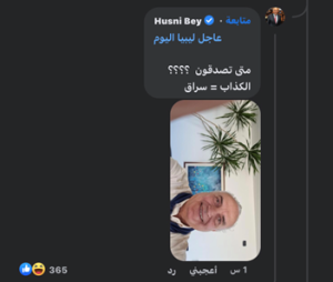 مرفقا بصورة يظهر بها شخص يُدّعى بأنه حسني بي يرتدي جهاز تنفّس، وبجواره طبيب، وقد تحصّل الادعاء على أكثر من 6200 تفاعل وأكثر من ألف تفاعل، و21 مشاركة مُنذ نشره.