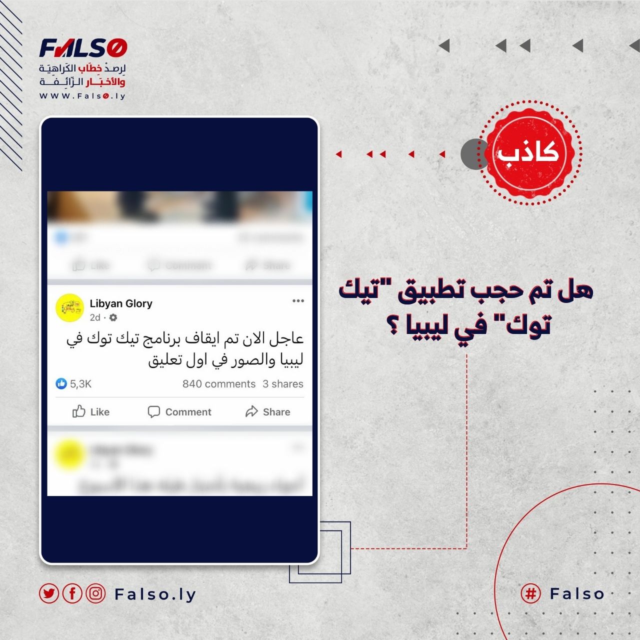 تداولت صفحات التواصل الإجتماعي على تطبيق “فيس بوك” خبر مفاده حجب تطبيق تيك توك في دولة ليبيا أبرزها صفحة glory libyan التي يبلغ عدد متابعيها أكثر من مليون مستخدم، الادعاء التالي: