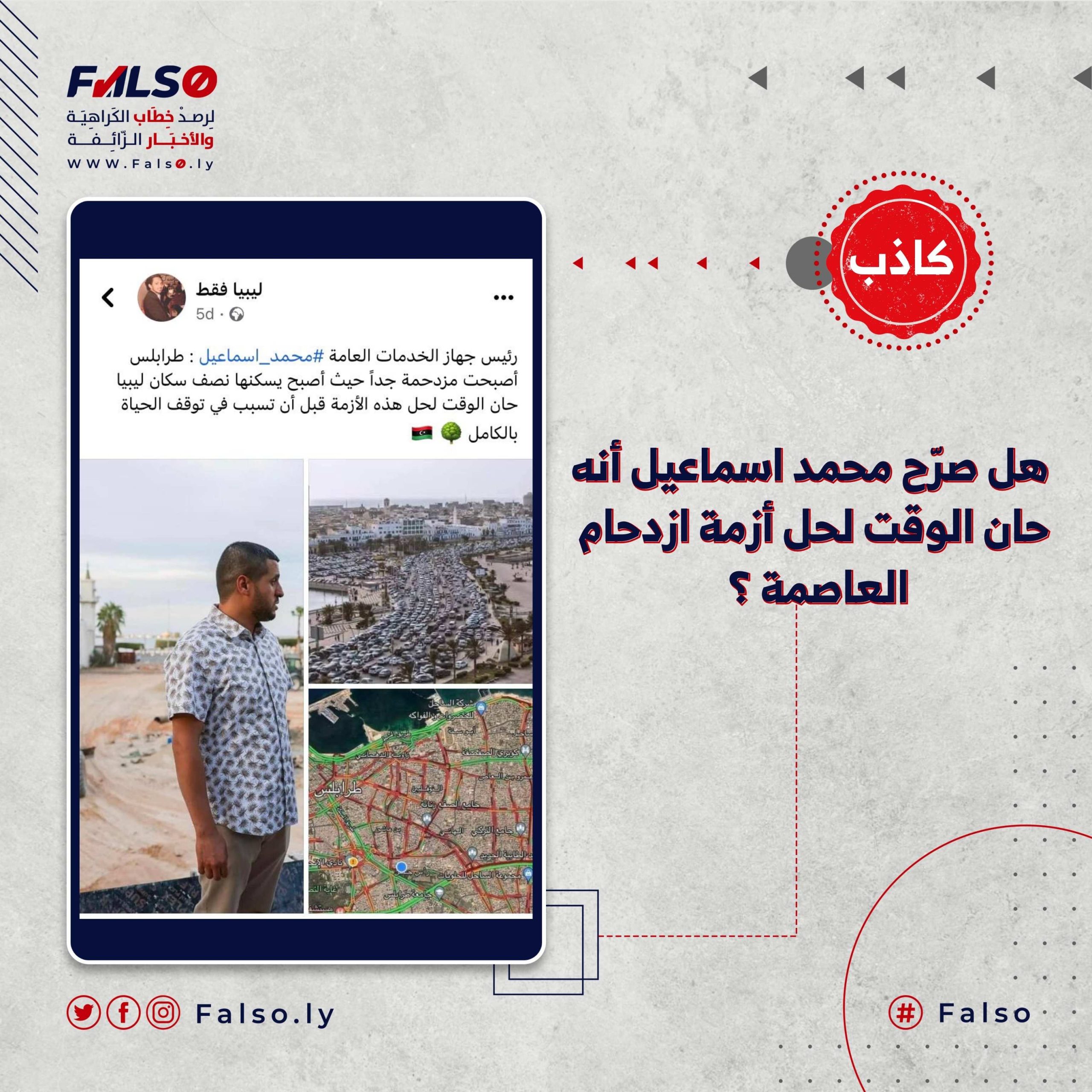 نشرت صفحة ليبيا فقط على الفيسبوك، والتي تمتلك عدد متابعين يصل إلى أكثر من مليوني و400 الف متابع، ادعاءًا تزعم أنه تصريح من رئيس شركة الخدمات العامة السيد “محمد اسماعيل” عن سبب الازدحام الشديد في طرابلس وجاء المنشور كالتالي: